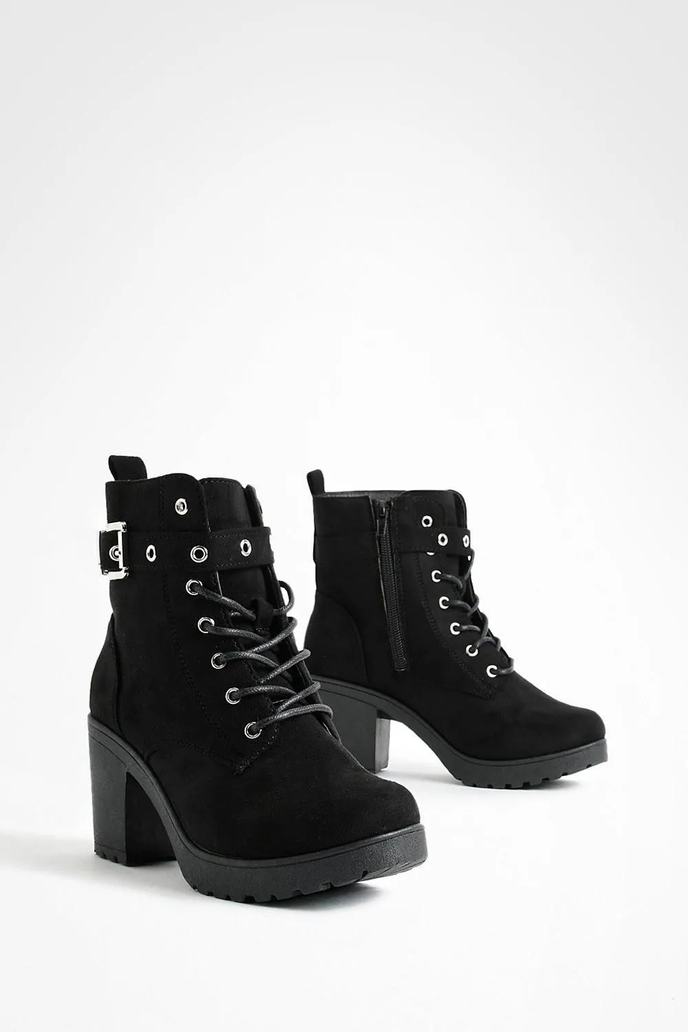 Wide Fit Faux Suede Buckle Lace Up Chunky Hiker Boots