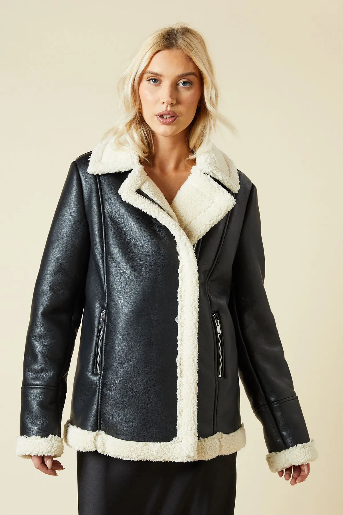 Sale!Faux Leather Teddy Trim Longline Aviator Jacket