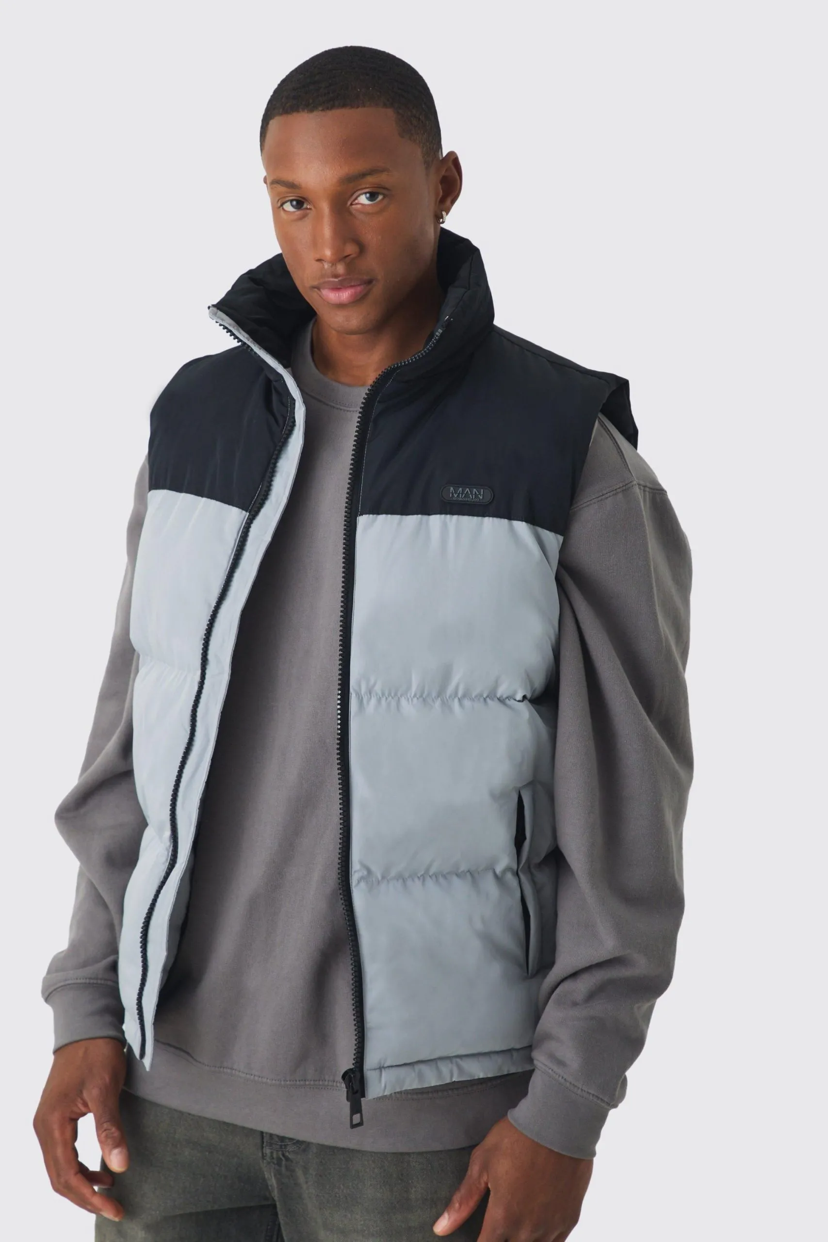 Sale!Man Tab Colour Block Puffer Funnel Neck Gilet In Grey