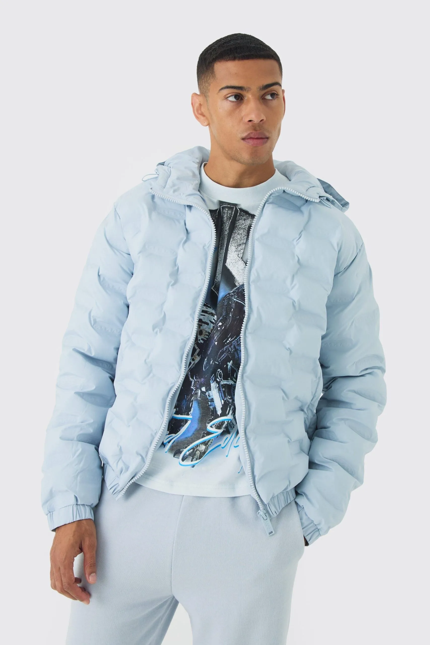 Sale!Man Heat Seal Hooded Puffer Coat In Light Blue