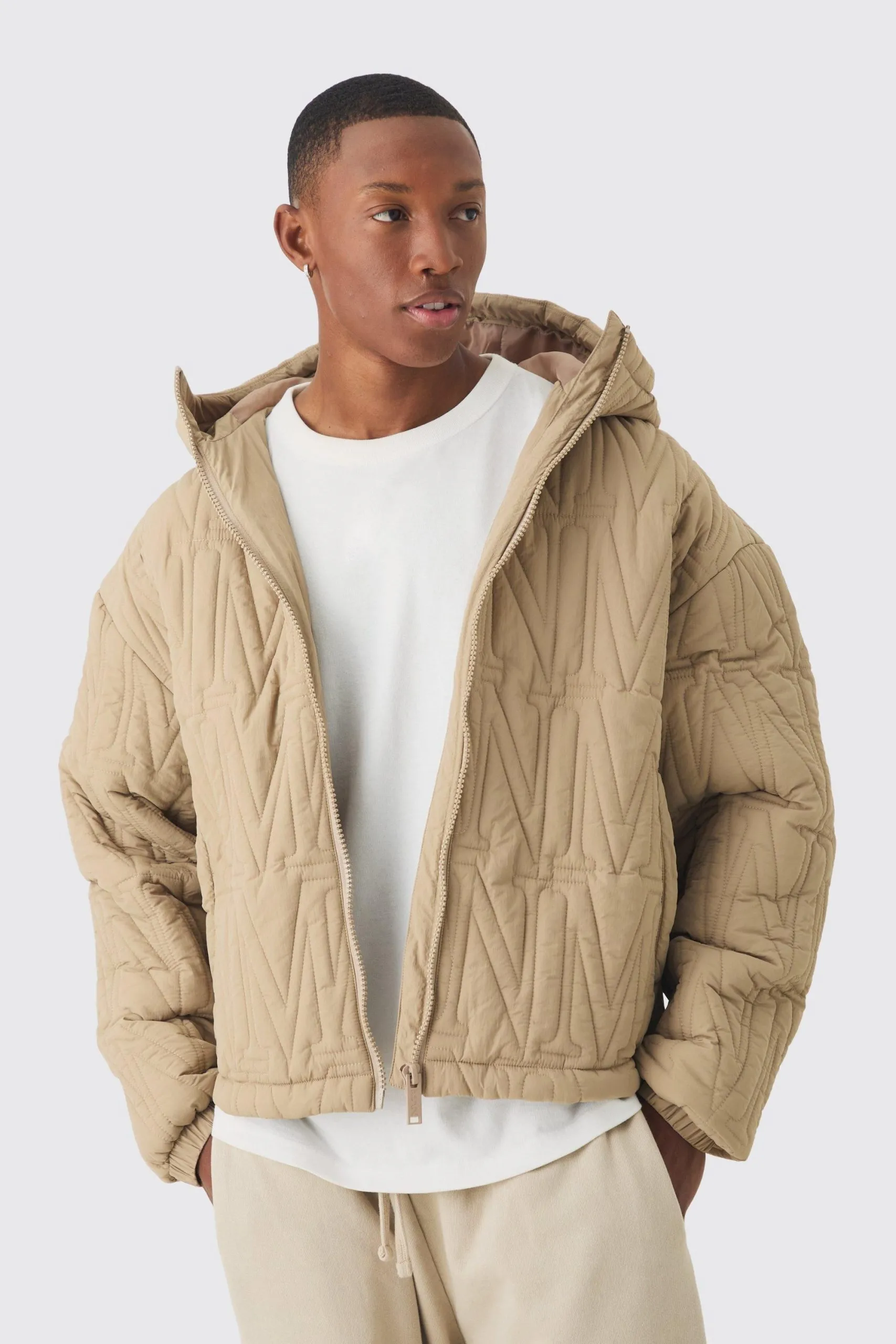 Sale!Man Quilted Hooded Puffer Coat In Taupe