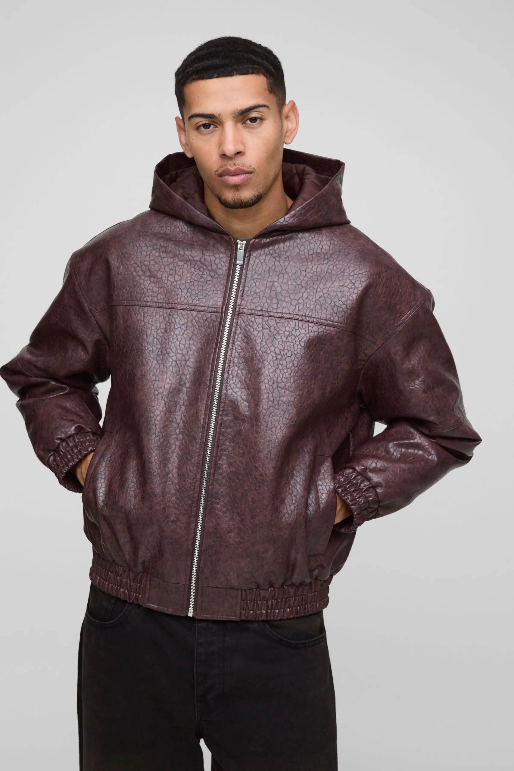 Oversized Boxy Textured PU Hooded Bomber Jacket