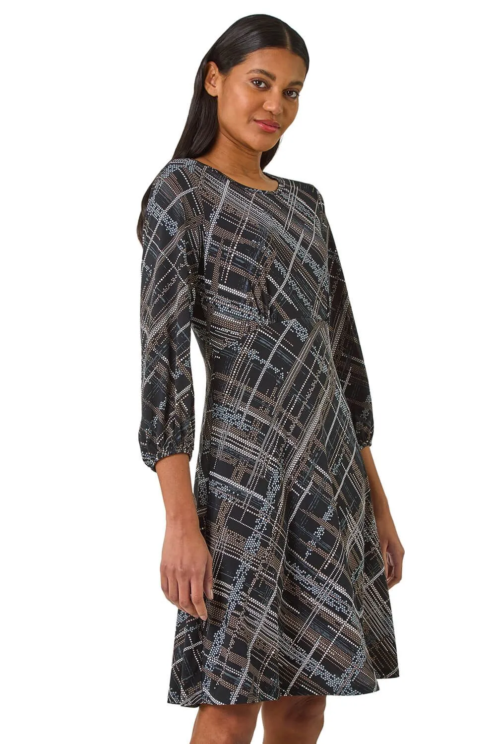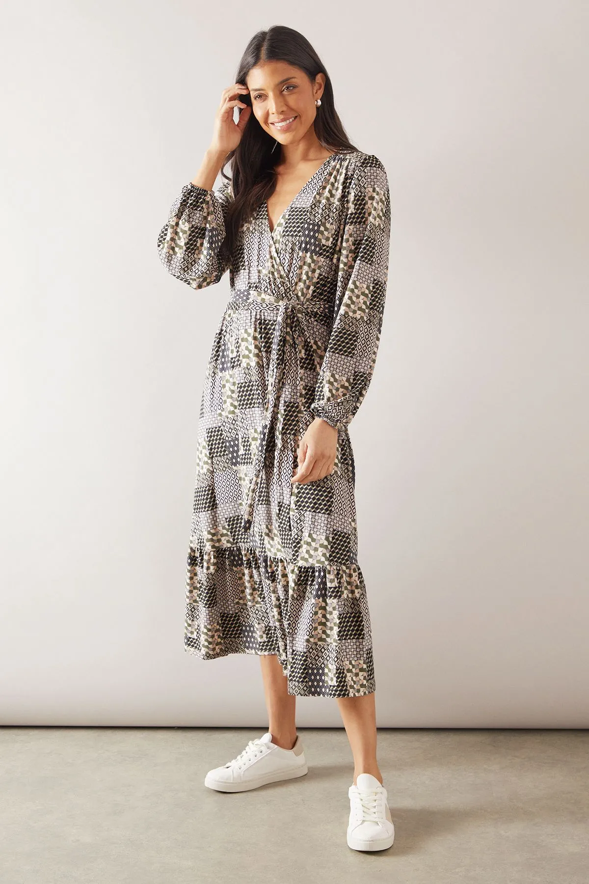 Abstract Jersey Long Sleeve Belted Midi Dress