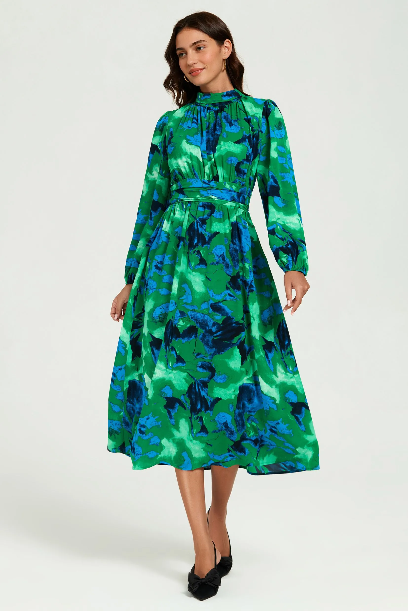 Abstract Floral Print Long Sleeve Midi Dress In Green