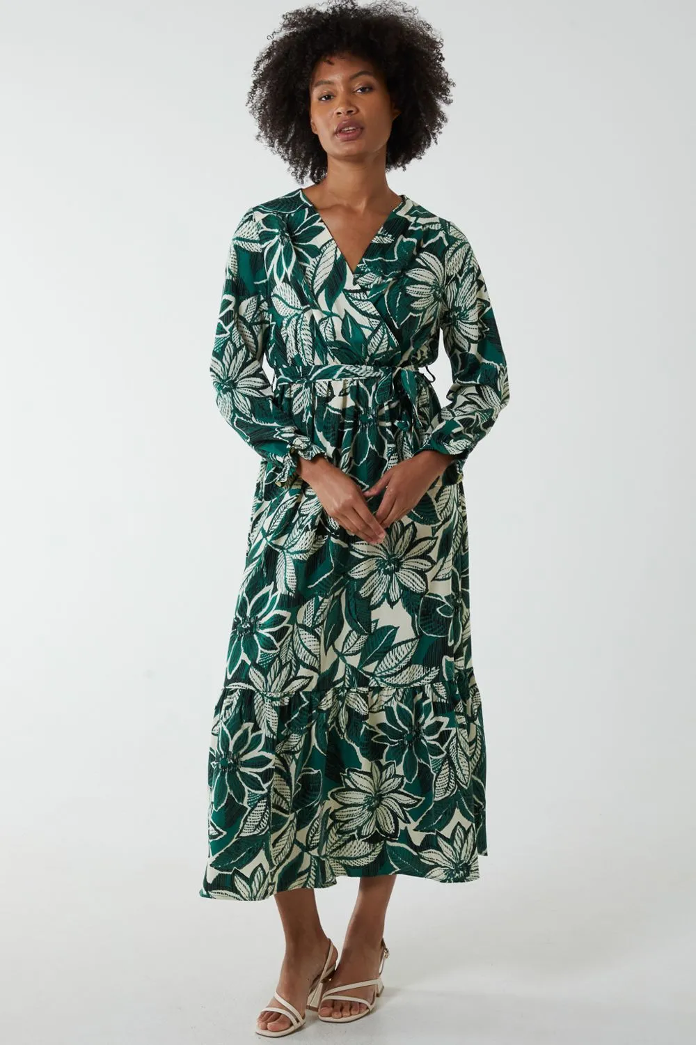 • Abstract Floral Print Long Sleeve Midi Dress In Green