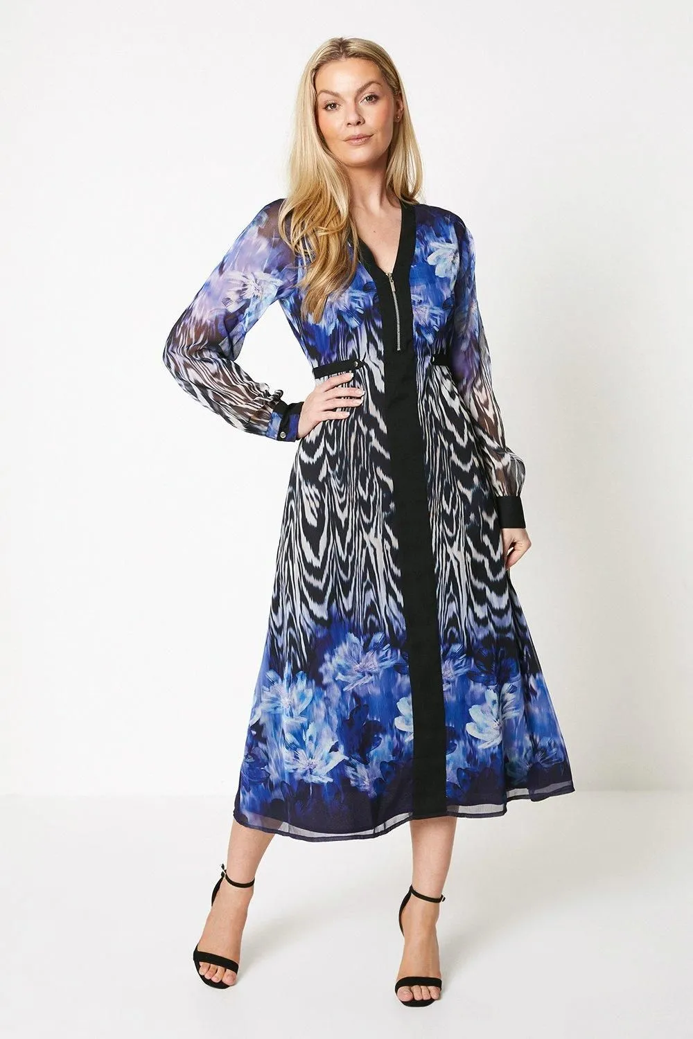 • Zip Front Spot Border Chiffon Midi Dress