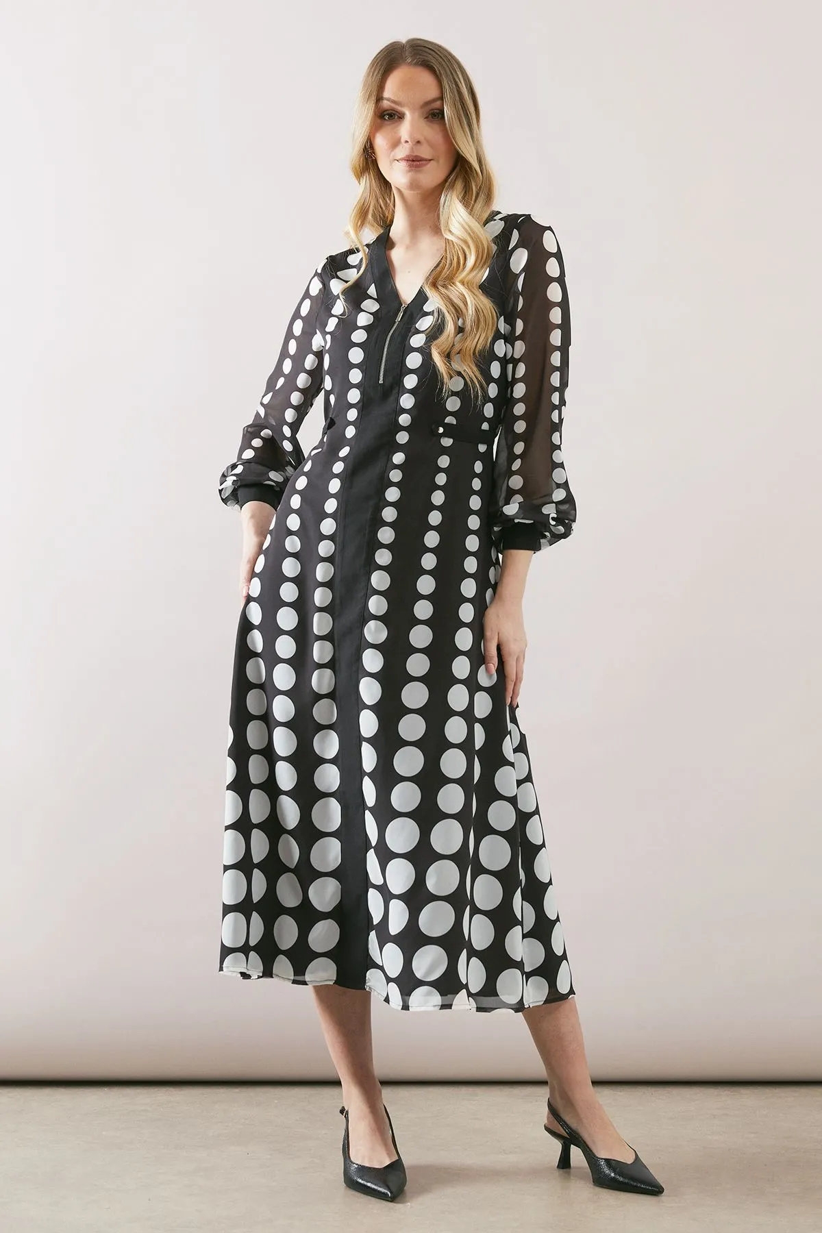 Zip Front Spot Border Chiffon Midi Dress
