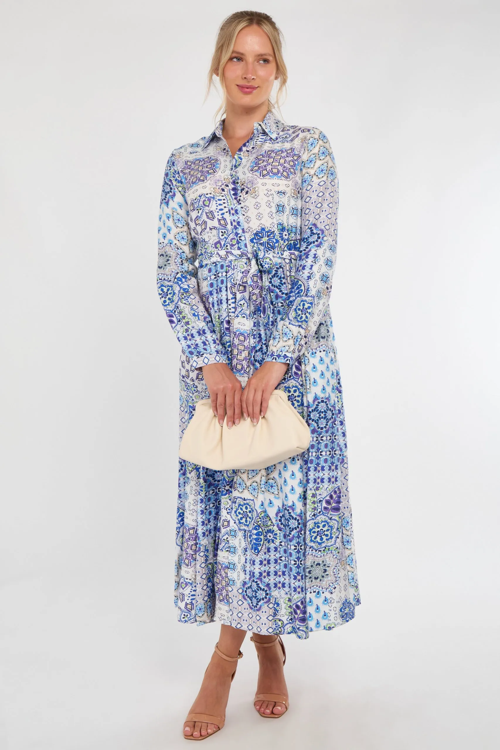 Blue Abstract Wrap Elasticated Waist Midaxi Dress