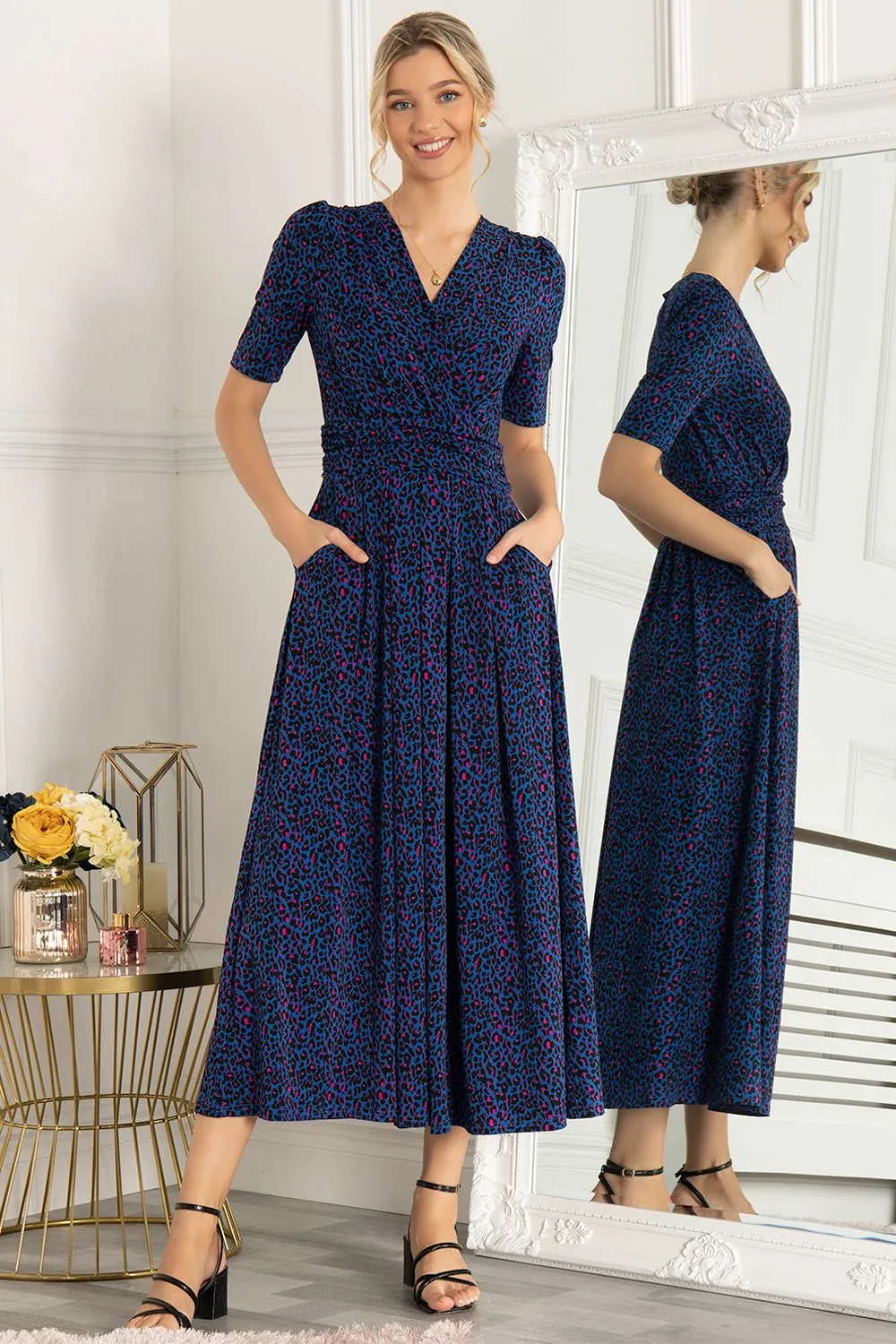 Sale!Angel Sleeve Frill Detail Chiffon V Neck Midi Dress In Blue Leopard Print