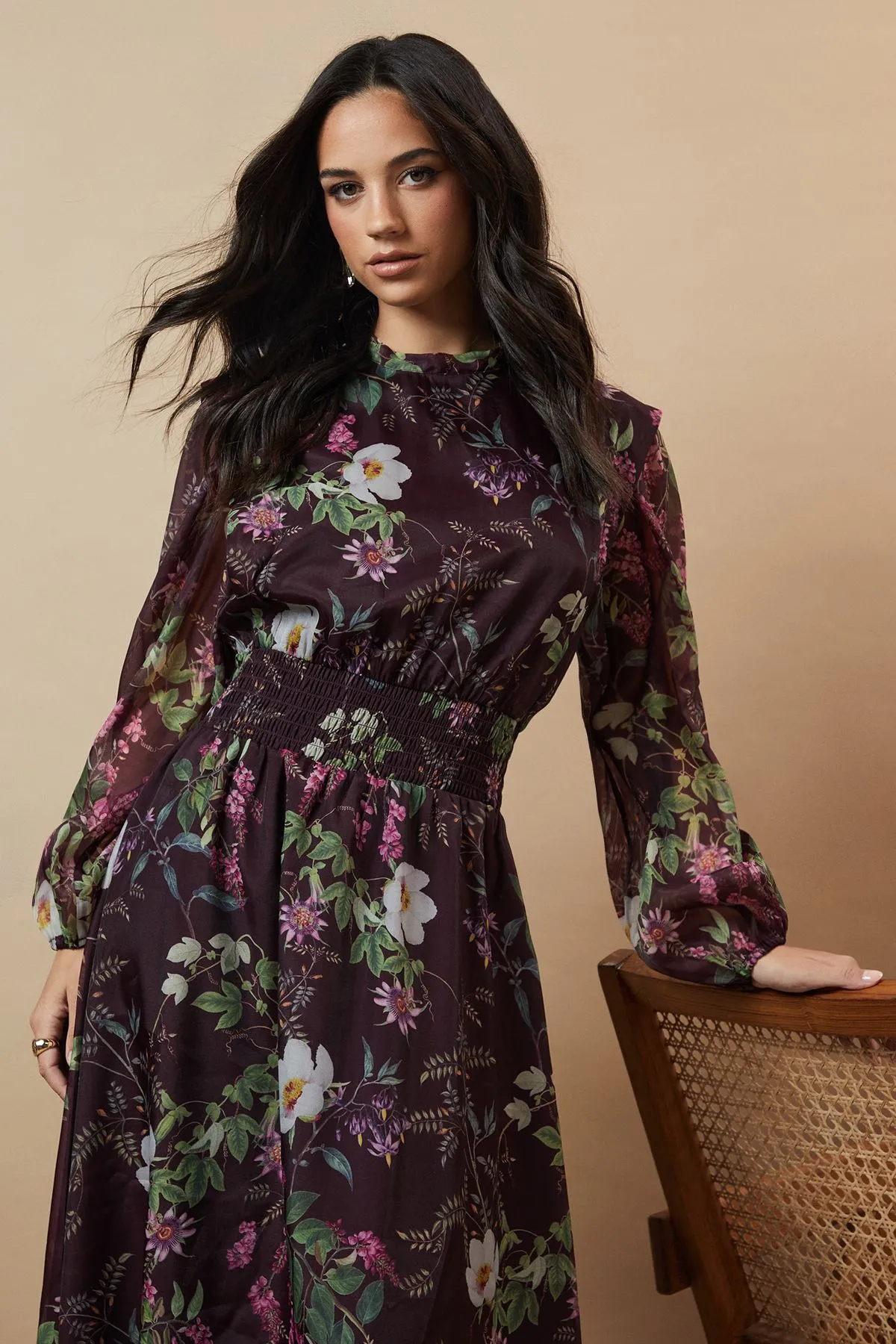 Sale!Floral Organza Shirred Waist Tie Back Midi Dress