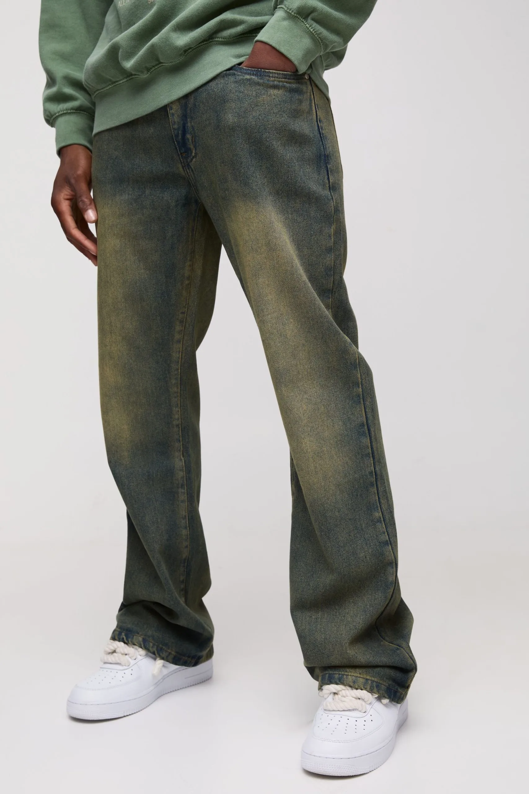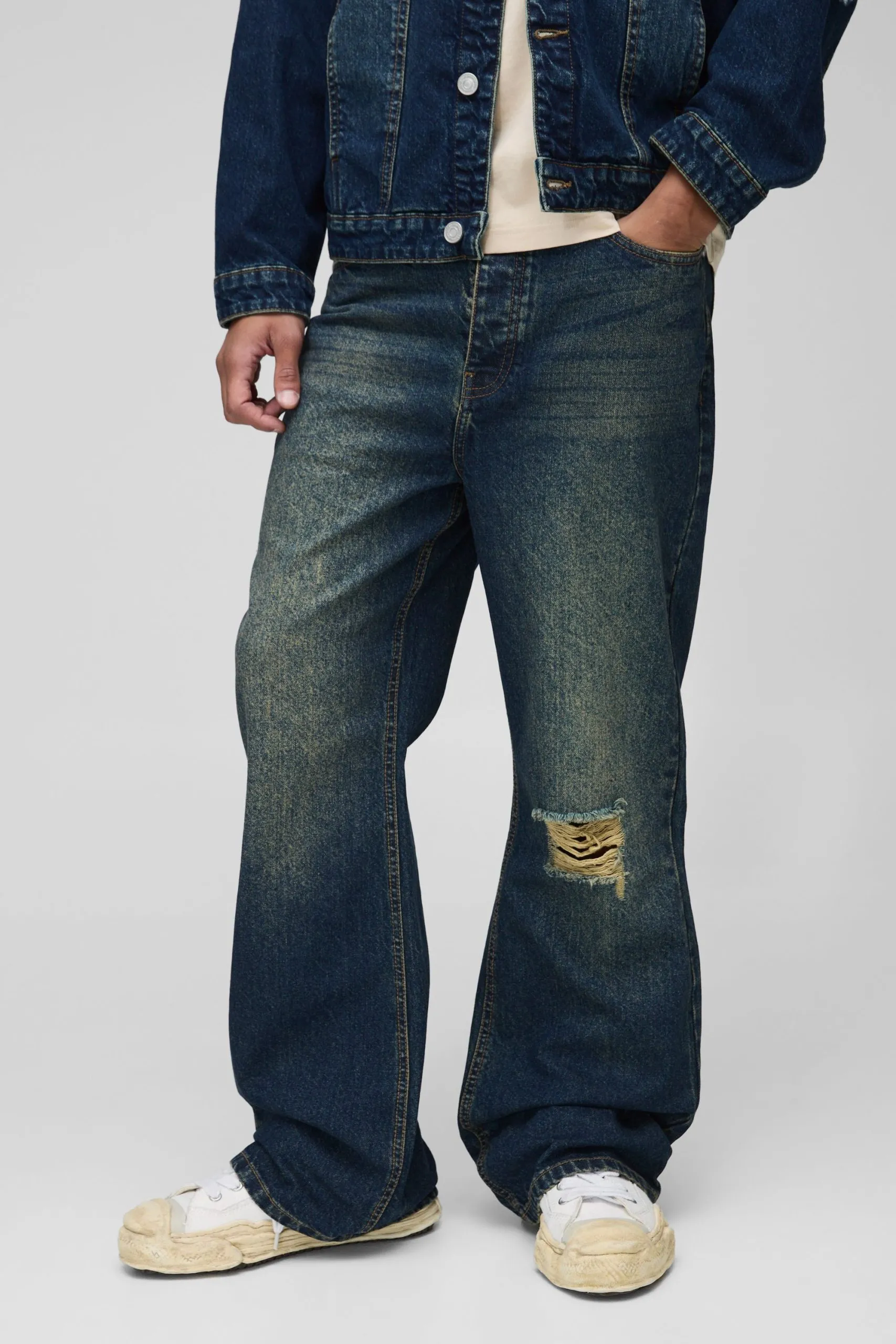 Relaxed Flared Ripped Knee Antique Wash Jeans