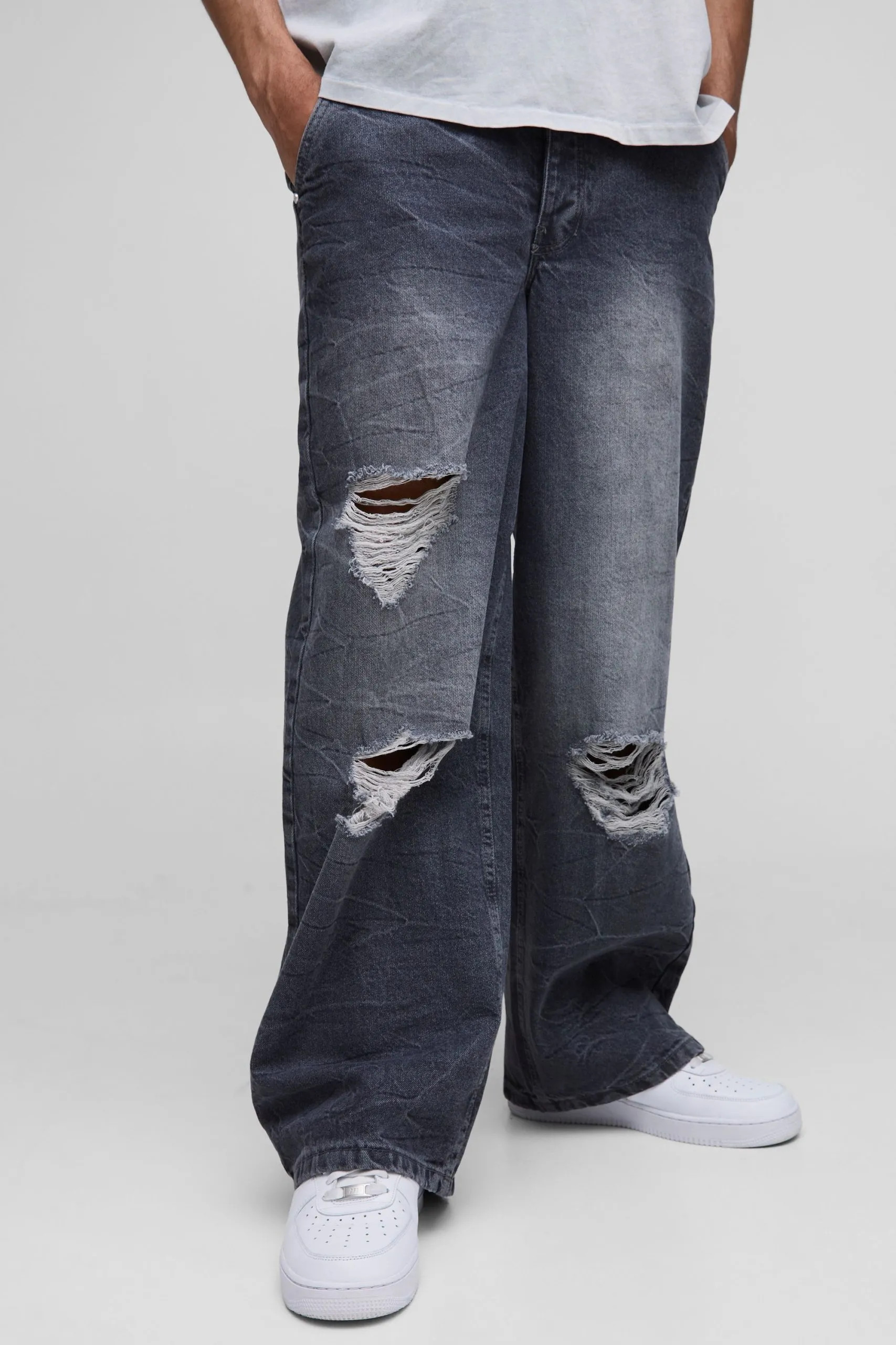 Baggy Rigid Boxer Waistband Ripped Crinkle Washed Denim Jeans