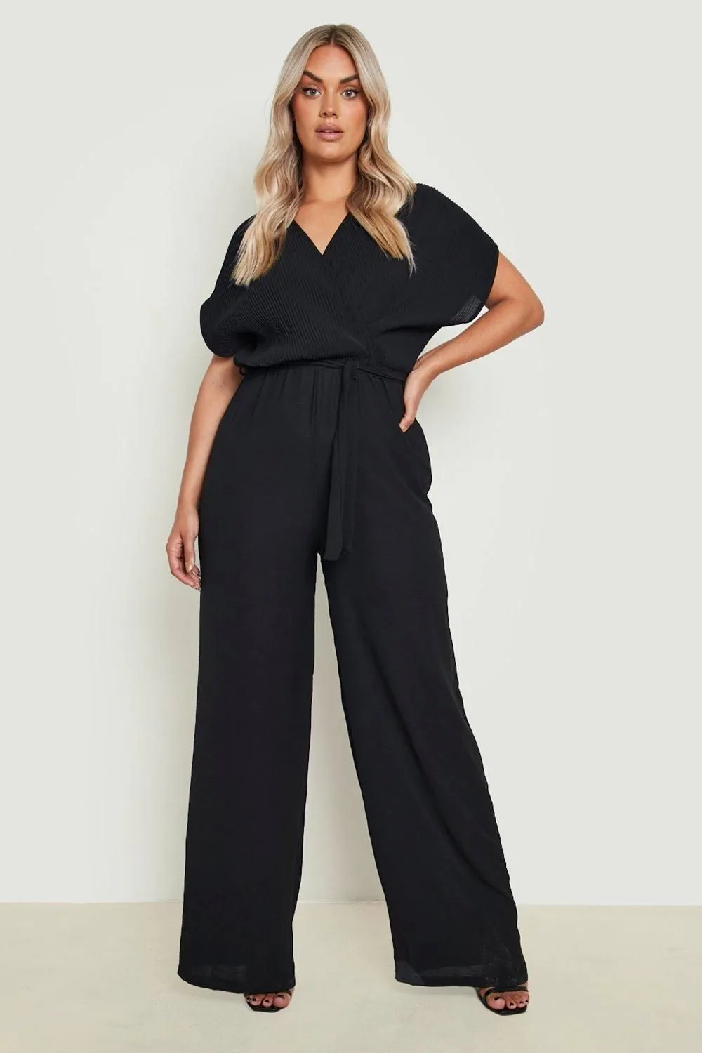 Plus Plisse Tie Belt Tapered Trouser Jumpsuit