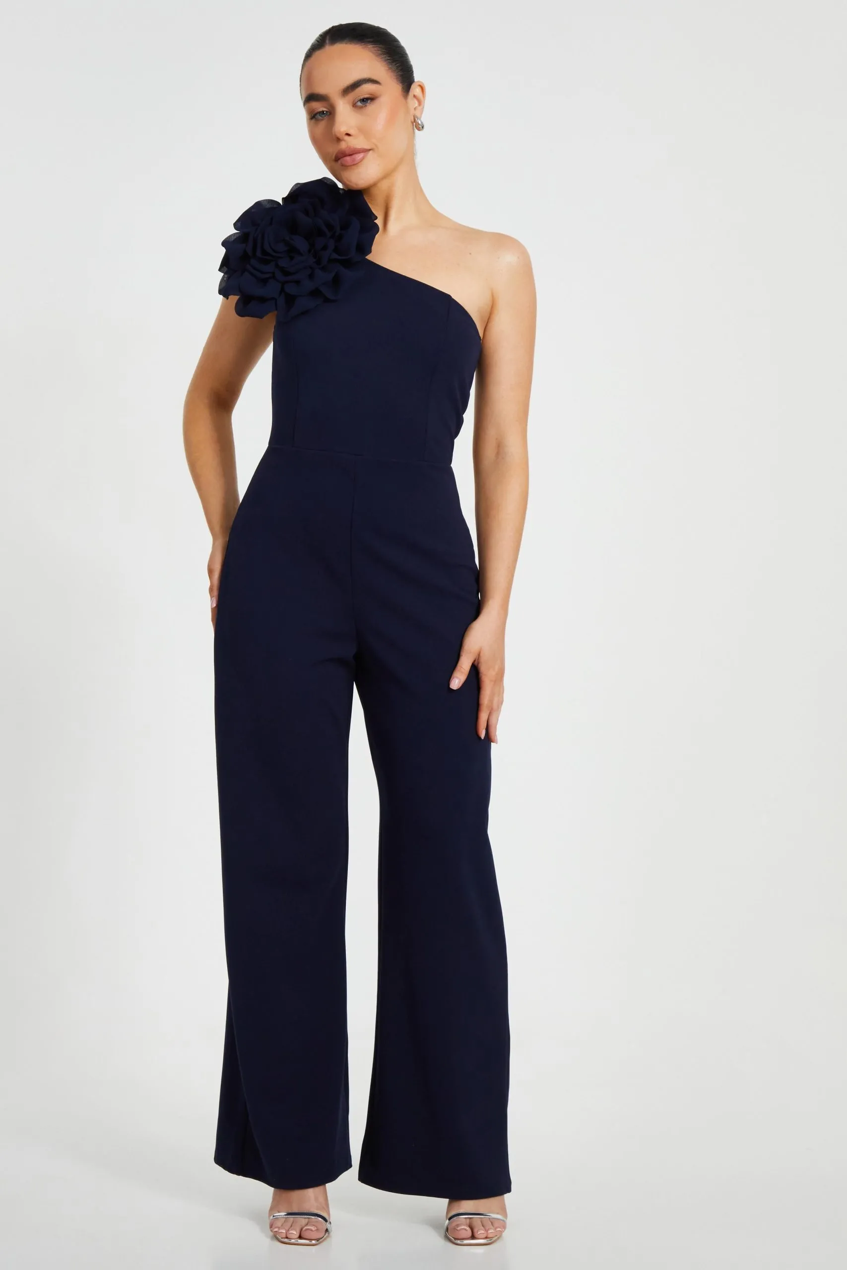 • Navy Petite One Shoulder Floral Jumpsuit