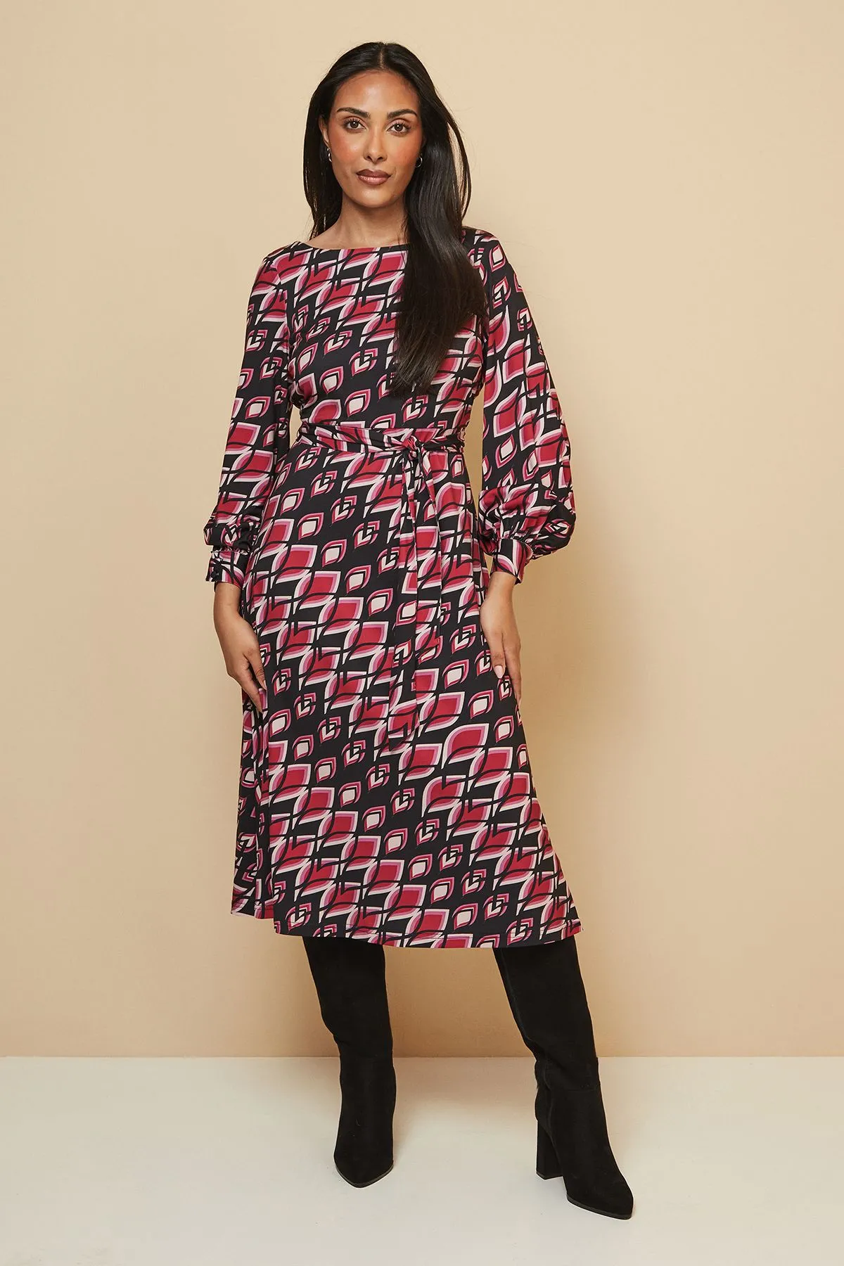 Sale!Petite Printed Jersey Belted Midi Dress