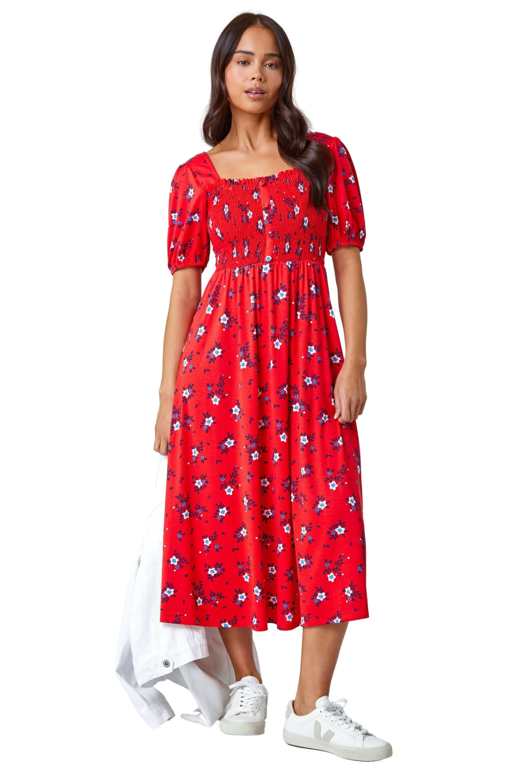 • Petite Shirred Stretch Floral Midi Dress