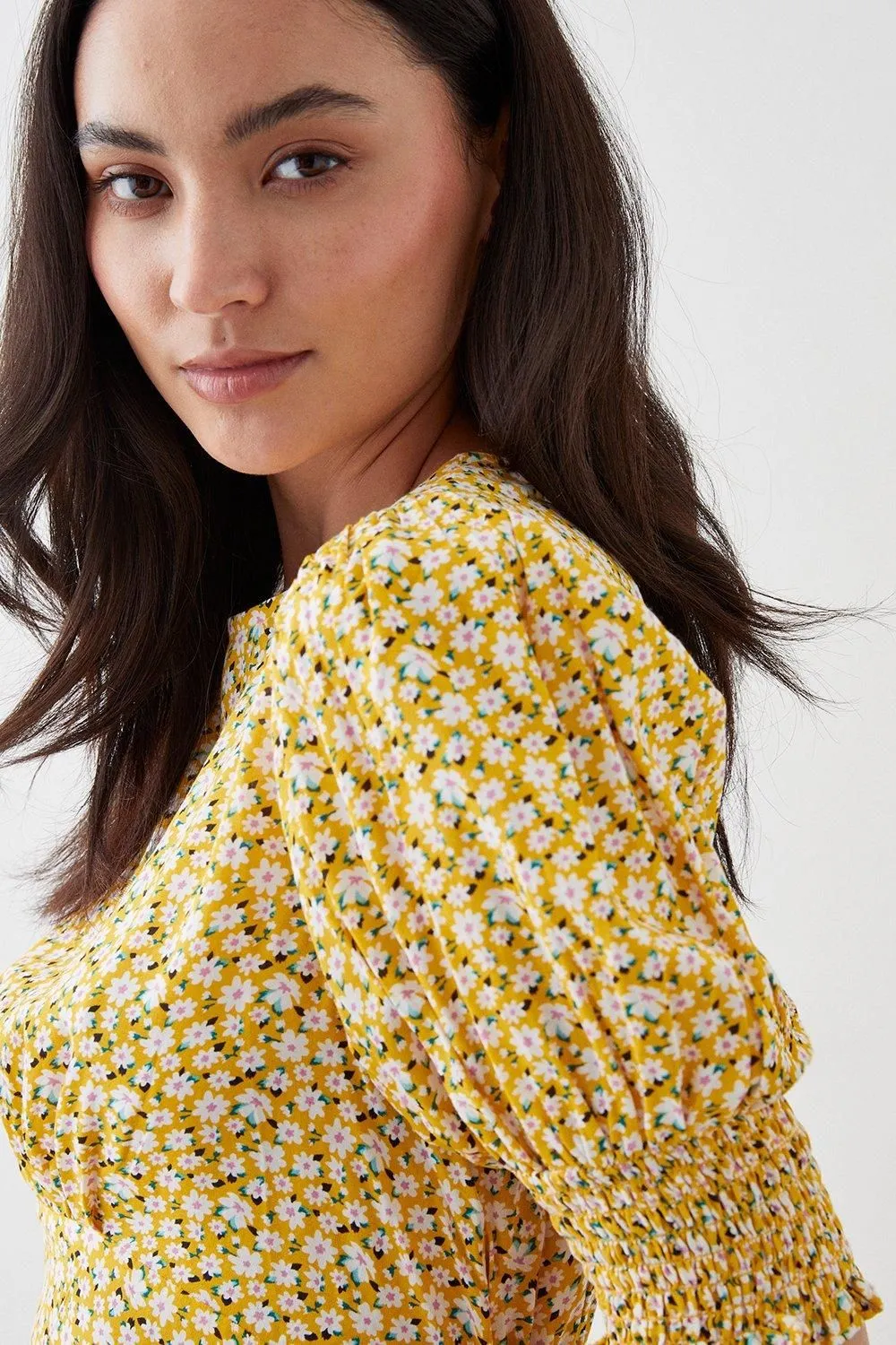 Petite Yellow Ditsy Shirred Cuff Midi Dress