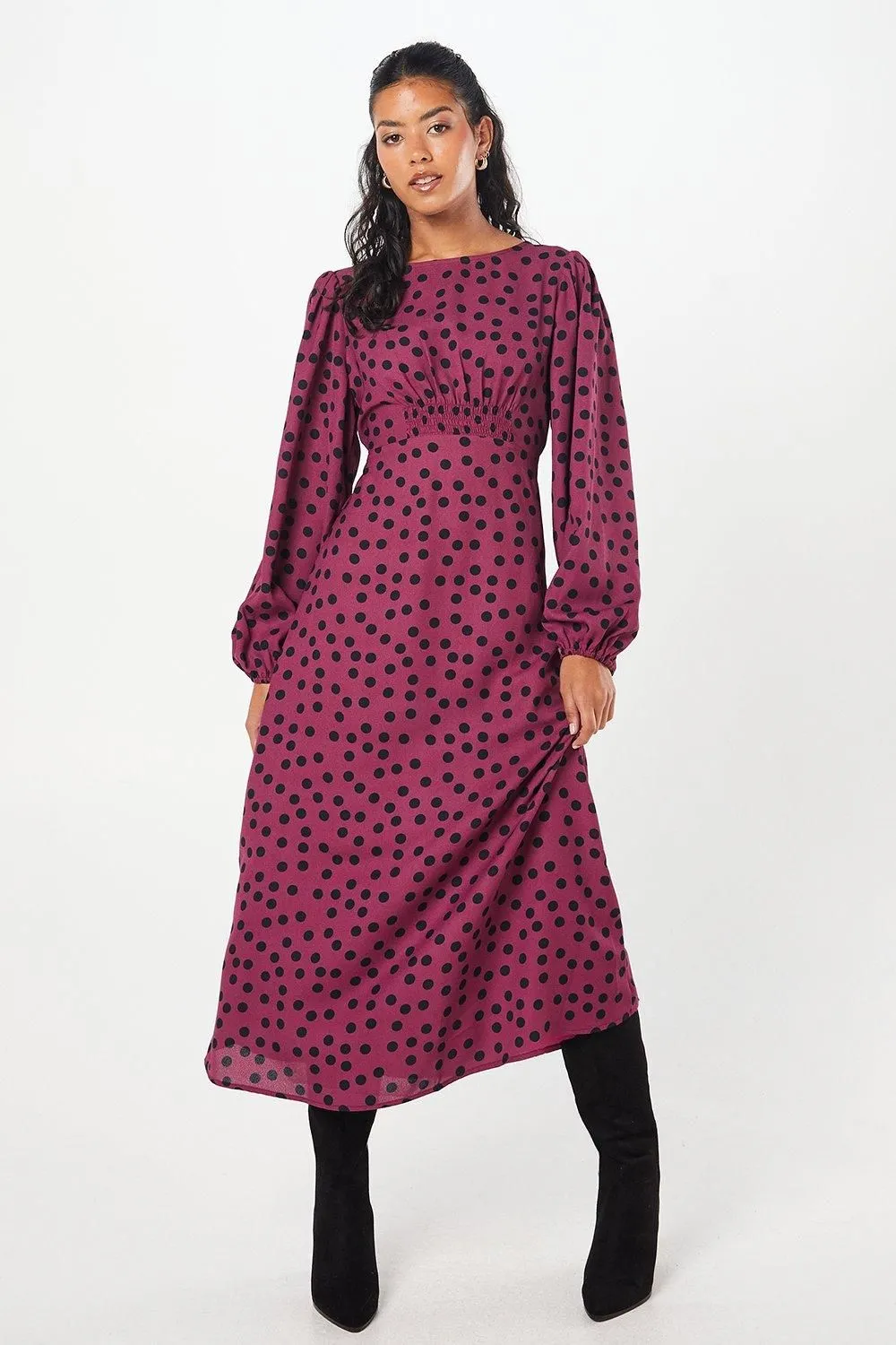 • Petite Berry Spot Shirred Waist Long Sleeve Midi Dress