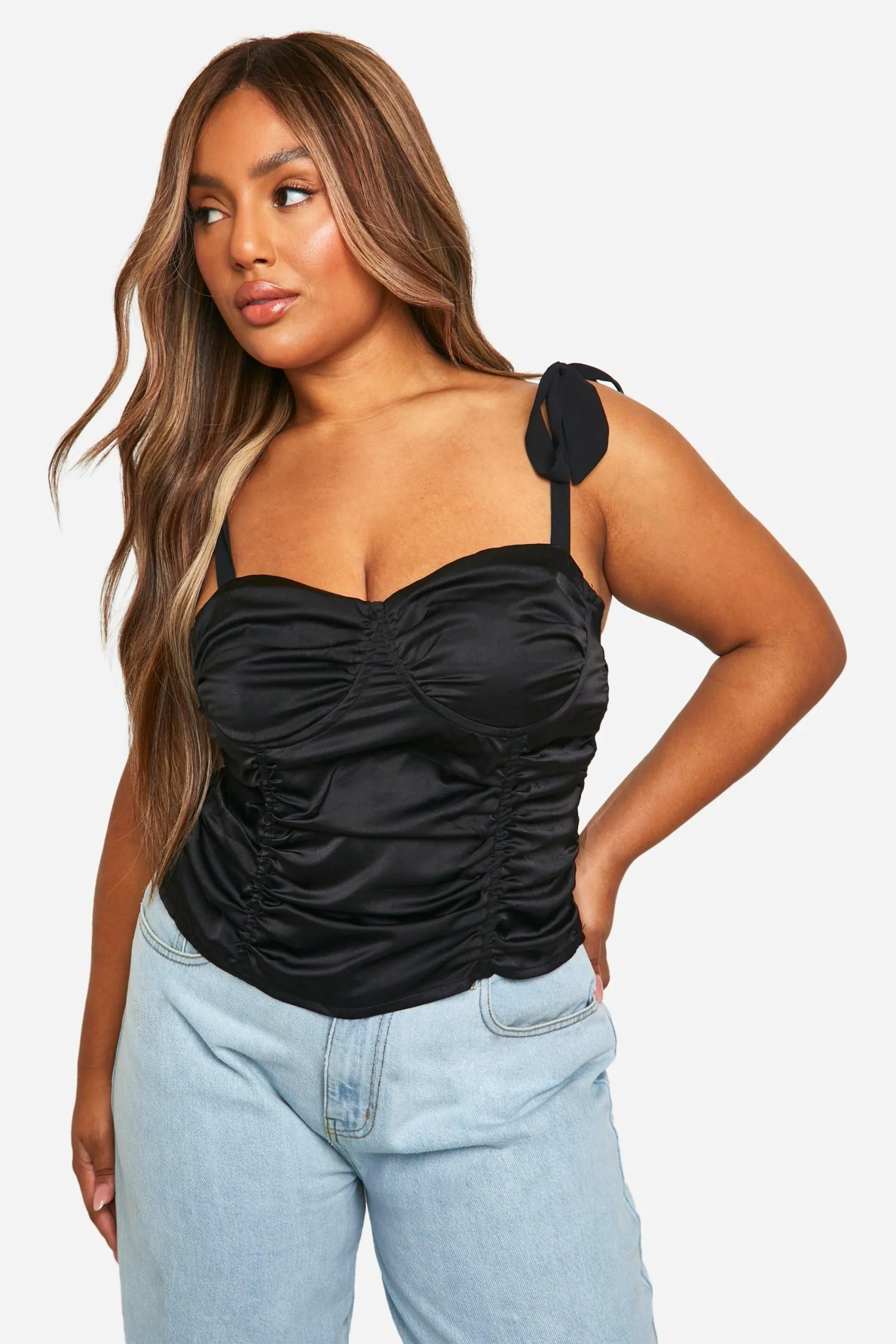 Sale!Plus Tie Shoulder Ruched Body Corset Top