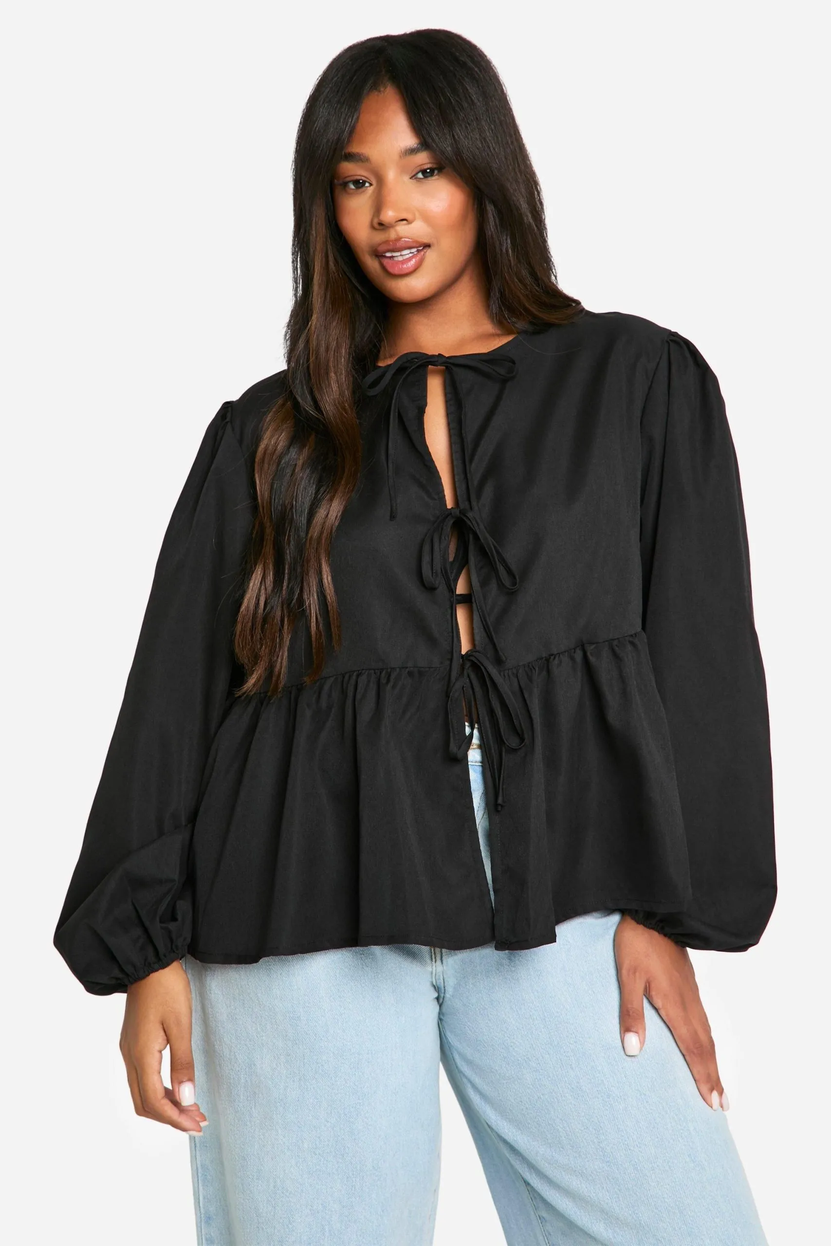 Sale!Plus Tie Front Long Sleeve Smock Top