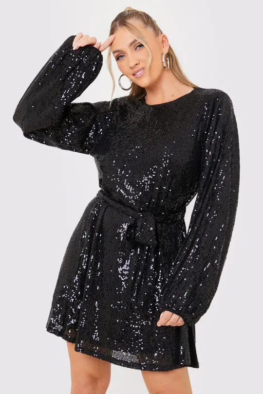 • In The Style Black Sequin Belted Balloon Sleeve Mini Dress