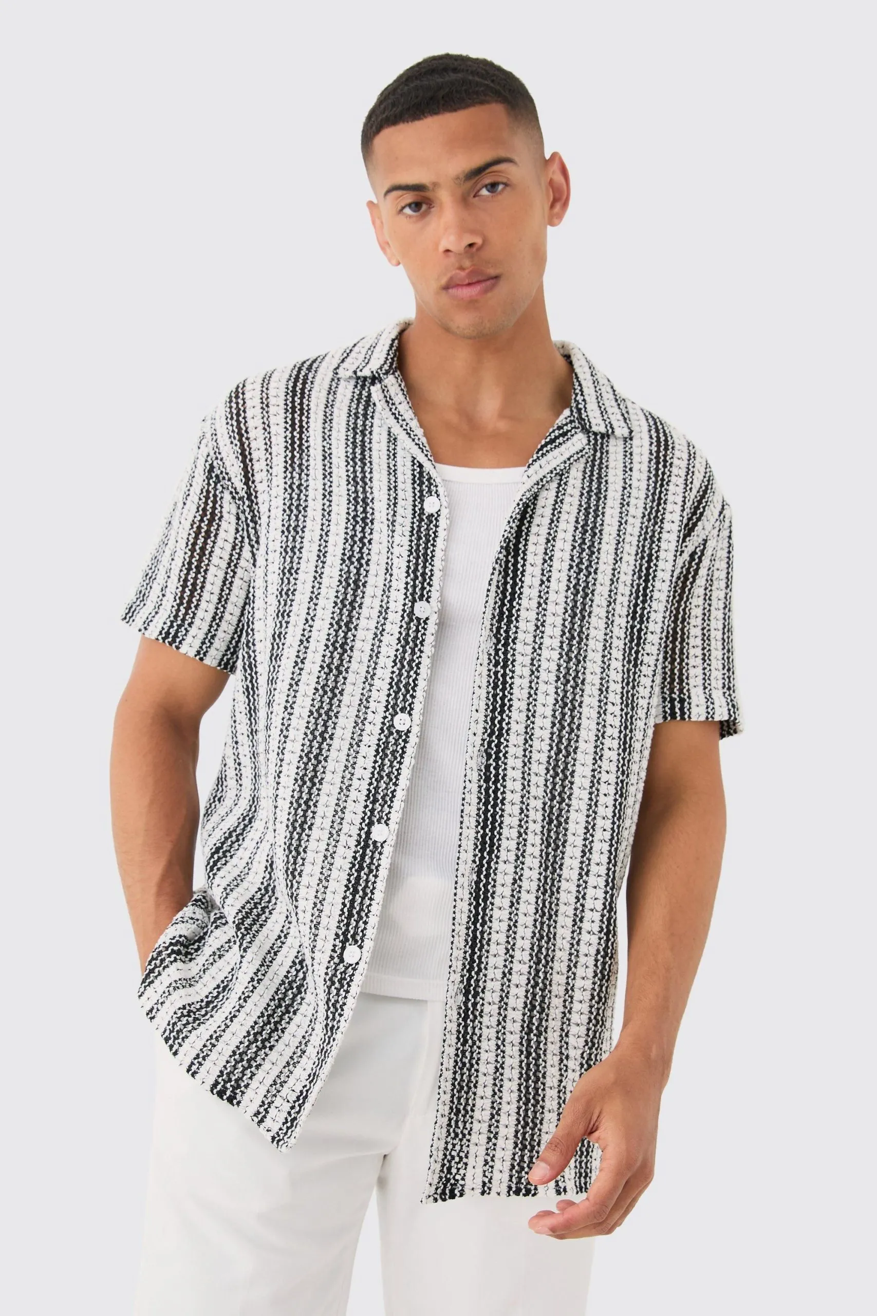 Sale!Short Sleeve Revere Oversized Open Knit Stripe Shirt