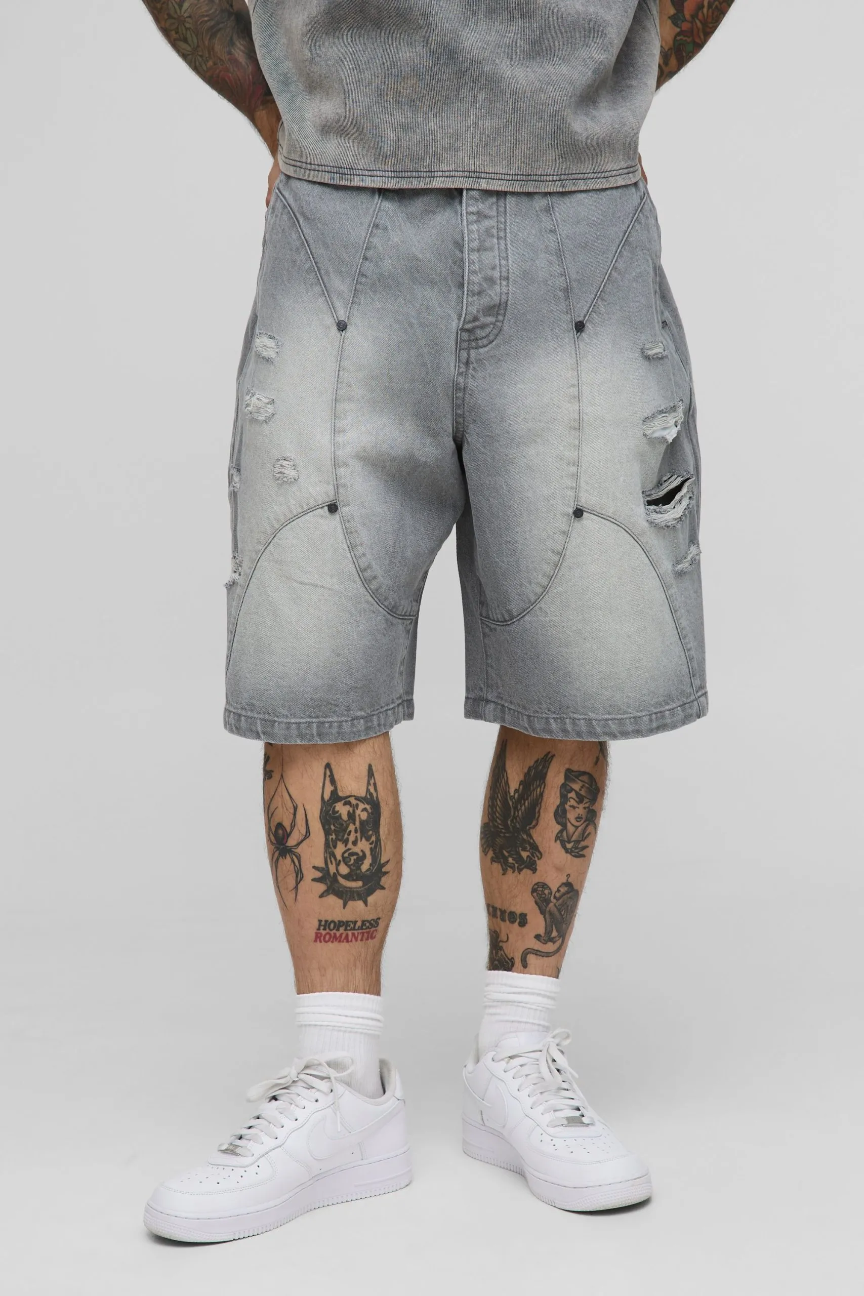 Parachute Ripped Paneled Ice Grey Denim Shorts