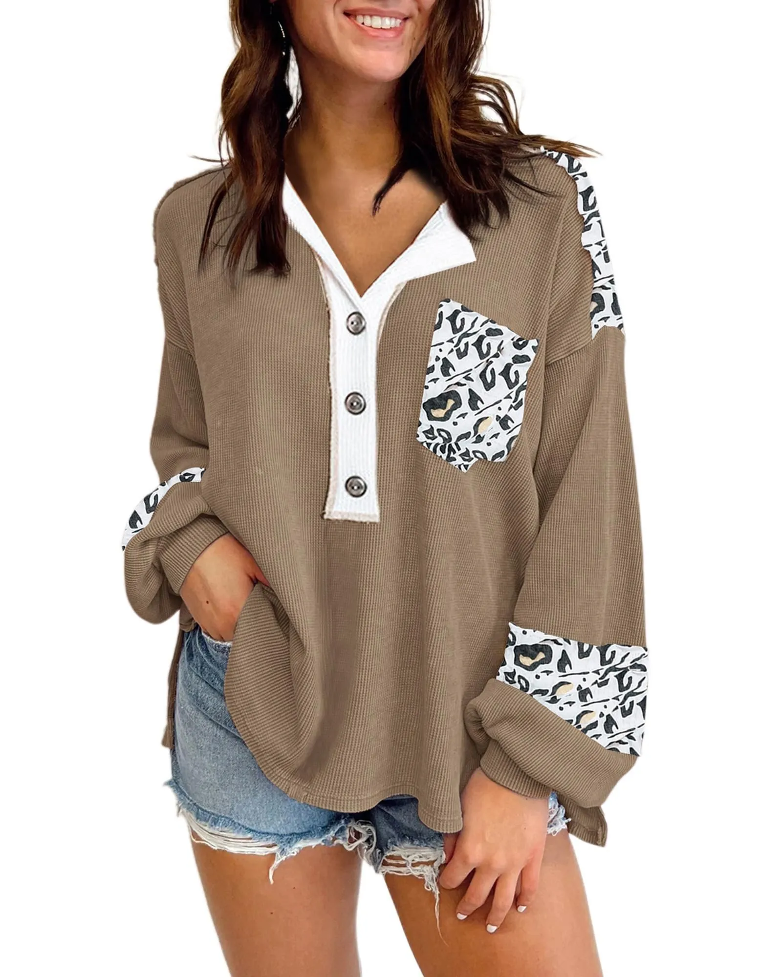 Sale!Chestnut Leopard Patchwork Chest Pocket Corded Henley Top