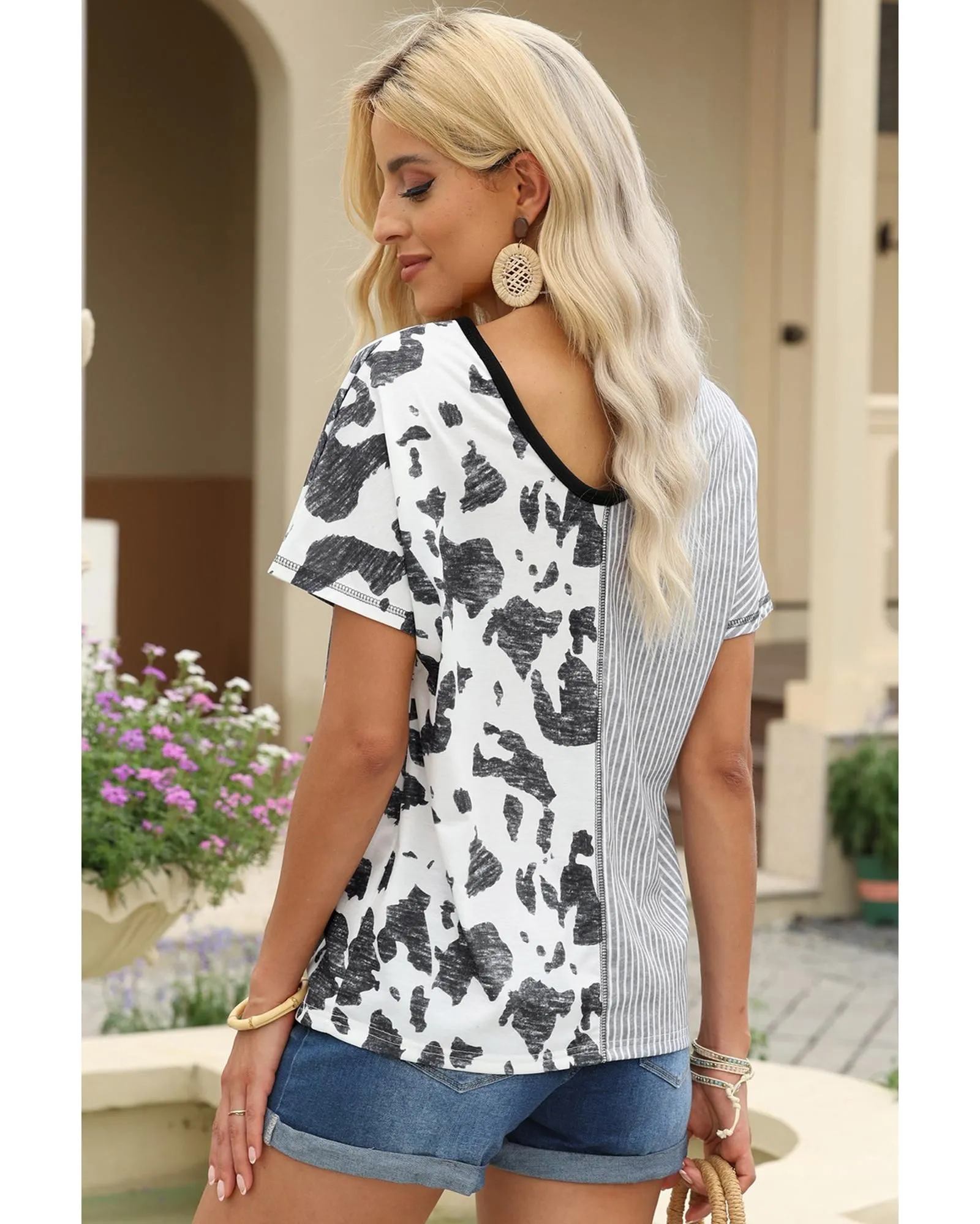 Sale!Contrast V Neck Tee with Stripes and Cow Print