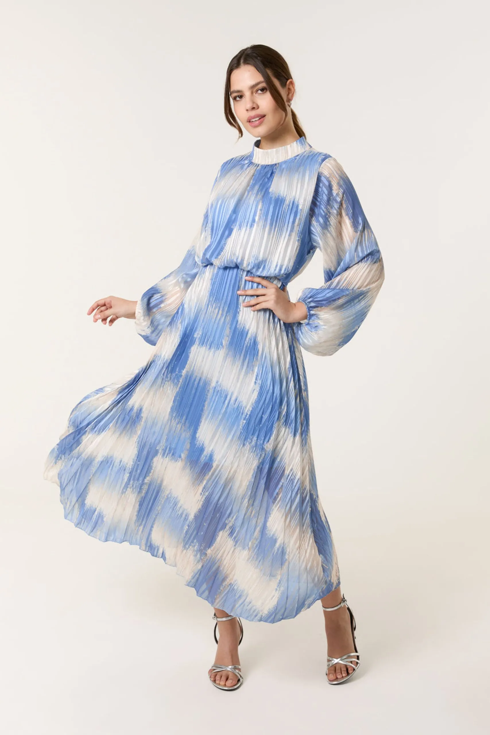 Sale!Blue High Neck Long Sleeve Printed Dress