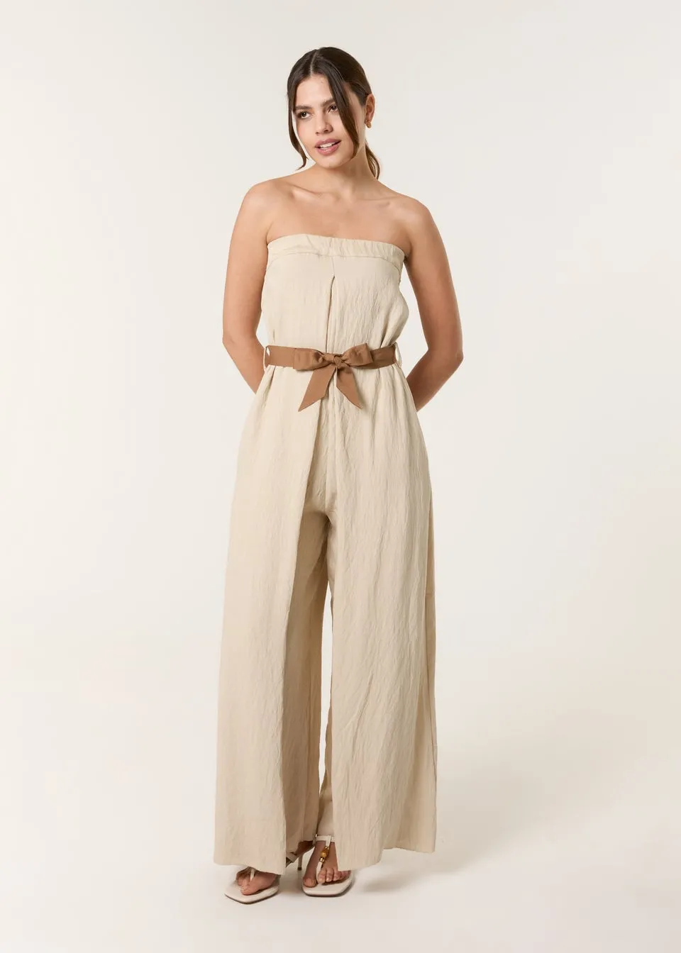 Sale!Blue Vanilla Beige Linen Belted Wide Bandeau Jumpsuit