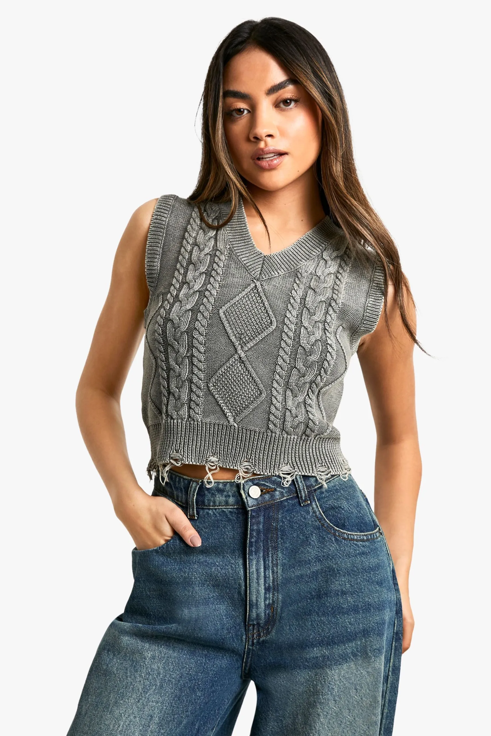Sale!Acid Wash Cable Knit V Neck Tank