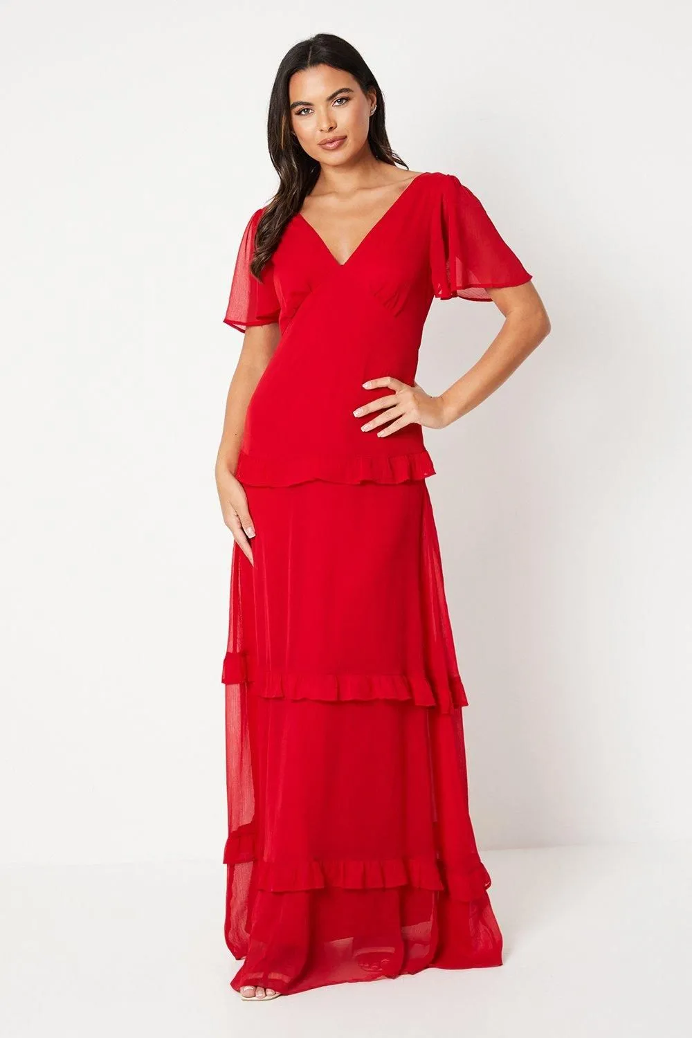 • Angel Sleeve Tiered Chiffon Midi Dress