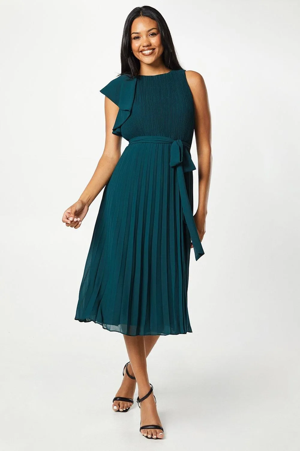 • All Over Pleated Tie Waist Midi Dress