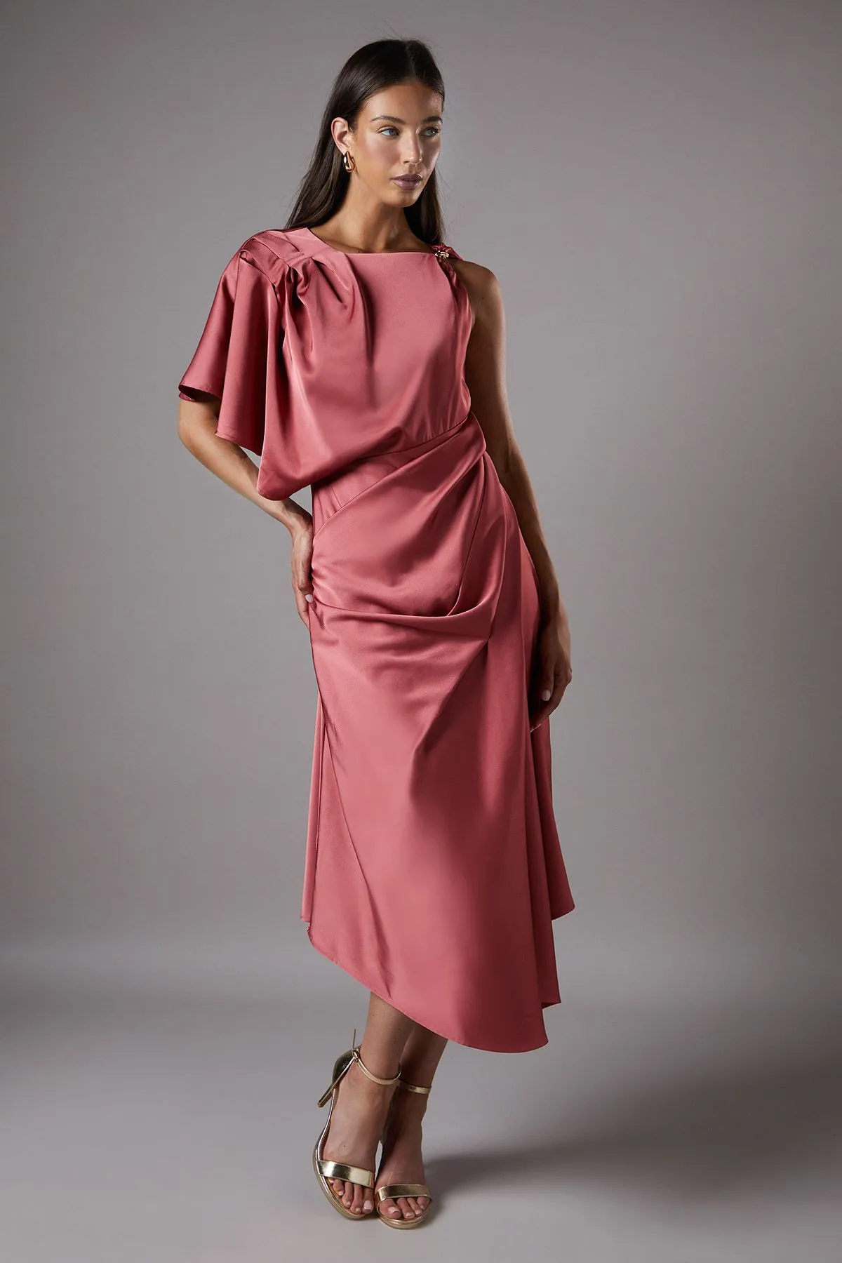 Asymmetric Pleated Midi Holiday Dress With Gold Detail