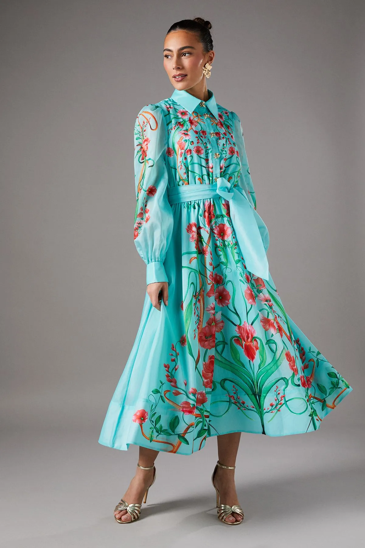 Sale!Blue Floral Puff Sleeve Midi Dress