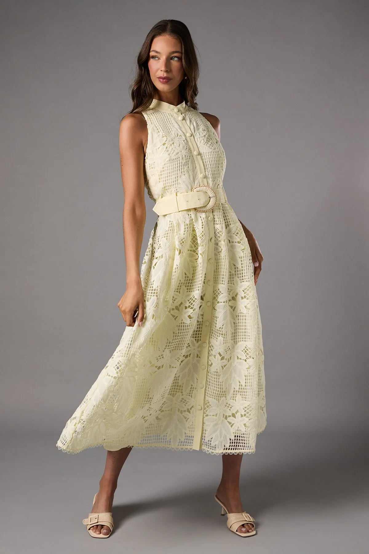 Sale!Belted Sleeveless Cutwork Lace Midi Dress