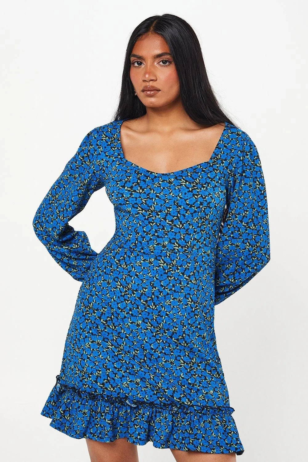 Sale!Petite Blue Ditsy Chiffon Ruffle Hem Long Sleeve Mini Dress
