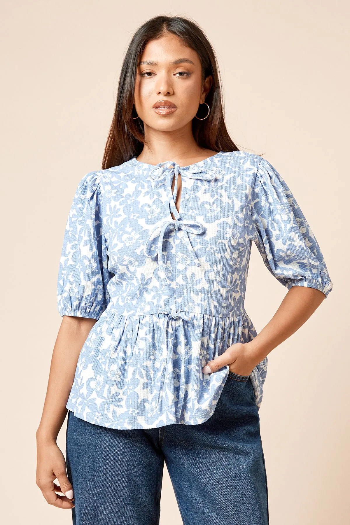 Sale!Petite Floral Bow Tie Front Puff Sleeve Jersey Top