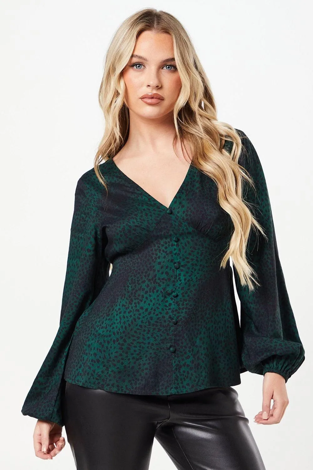 Sale!Petite Khaki Animal Long Sleeve Button Front Tea Blouse