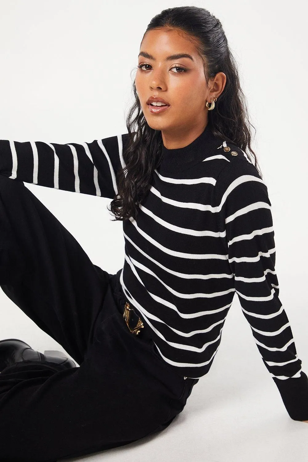 Sale!Stripe High Neck Button Shoulder Jumper
