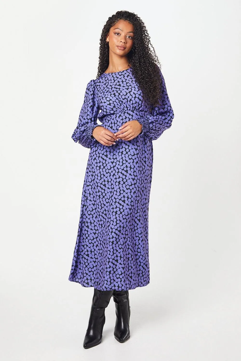 Sale!Tall Blue Spot Shirred Cuff Long Sleeve Midi Dress