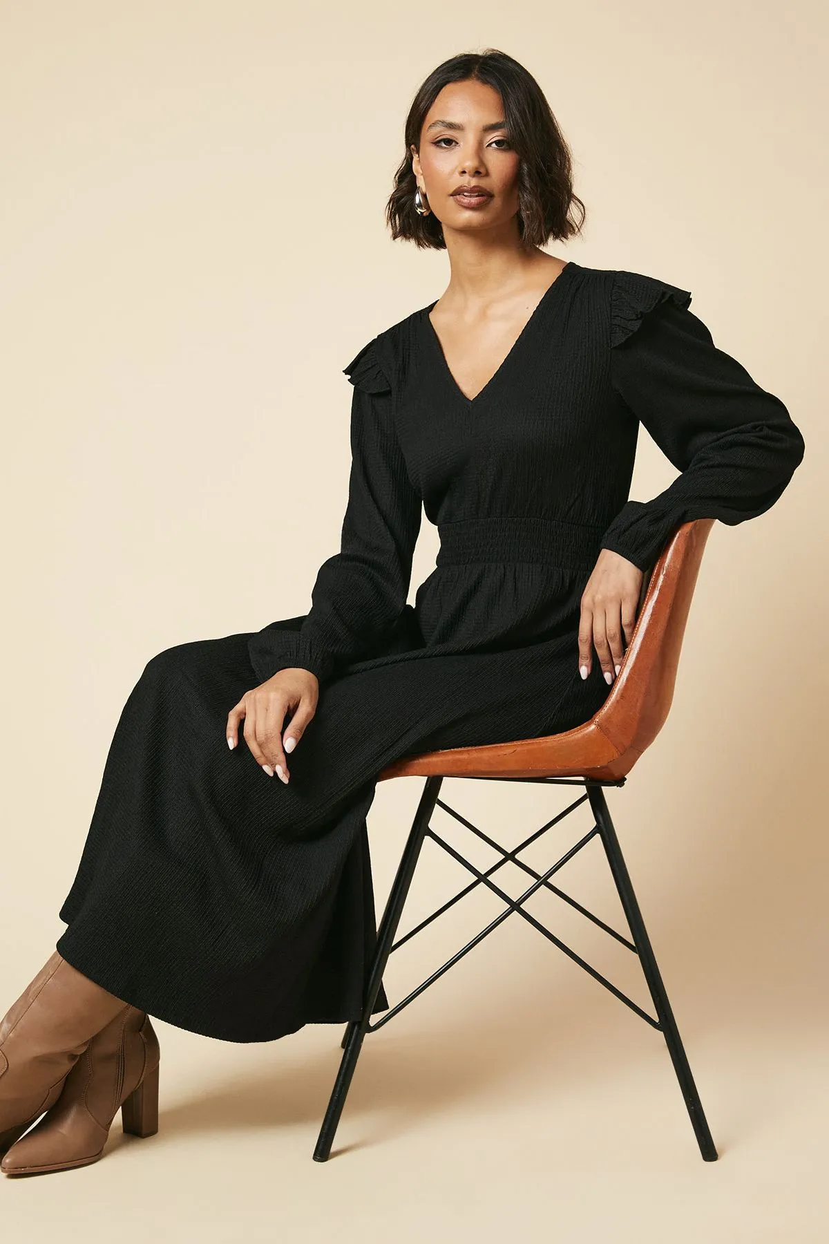 Sale!Tall Black Frill Shoulder Shirred Waist Long Sleeve Midi Dress