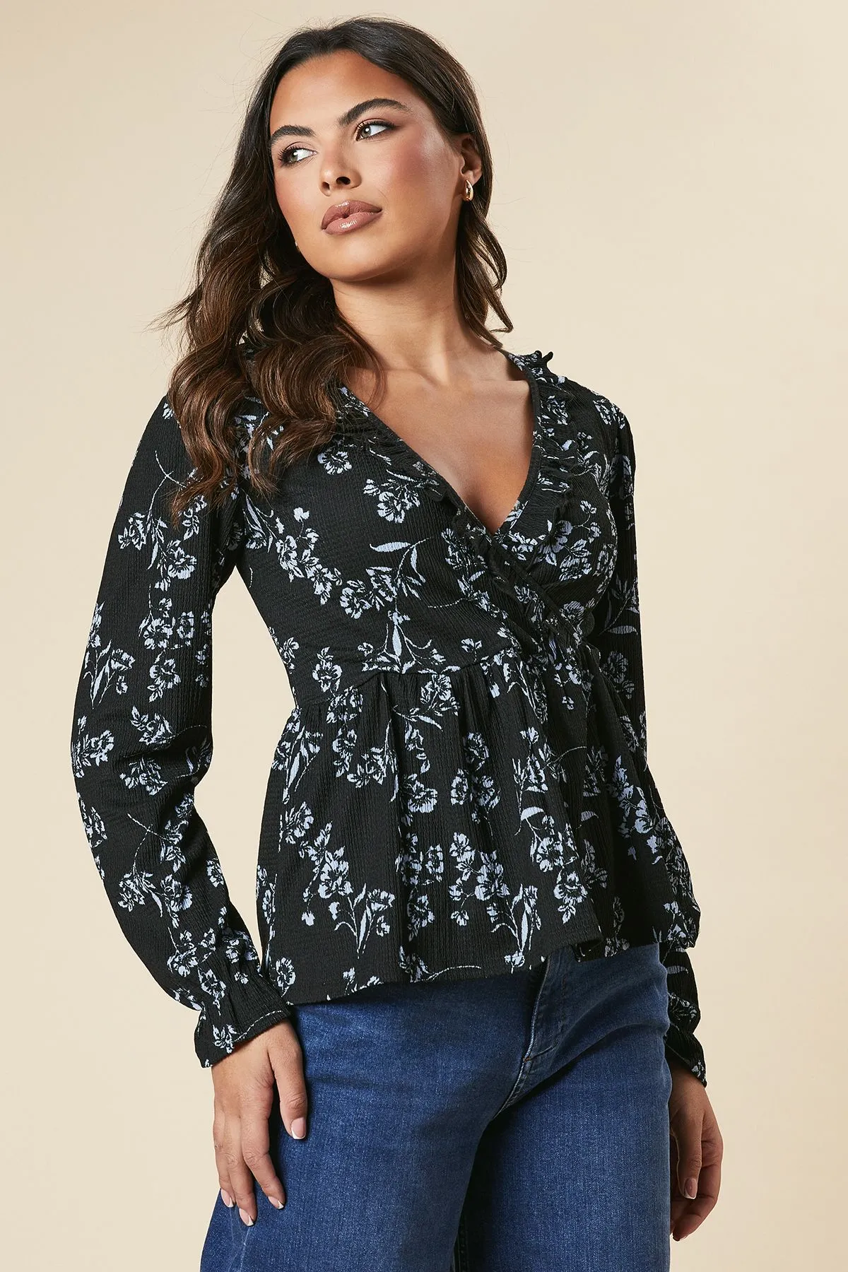 Sale!Blue large floral Ruffle wrap long sleeve top