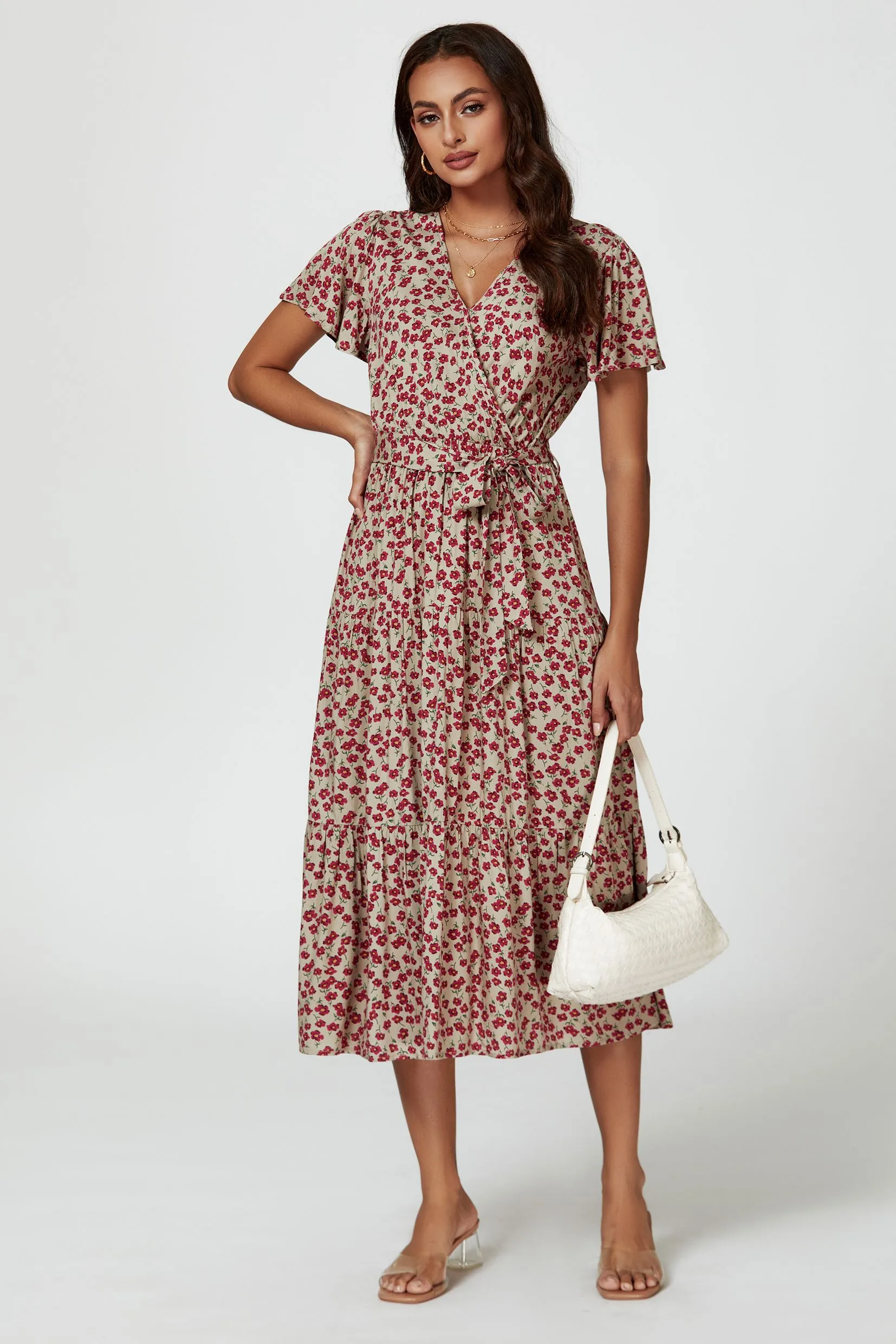 Off Shoulder Hem Detail Floral Print Midi Dress In Beige