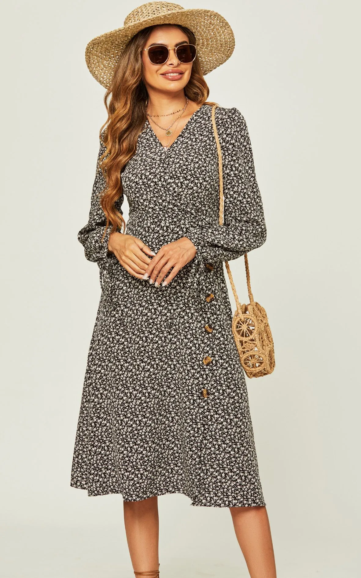 Sale!Side Zip Button Detail Floral Midi Wrap Dress In Black