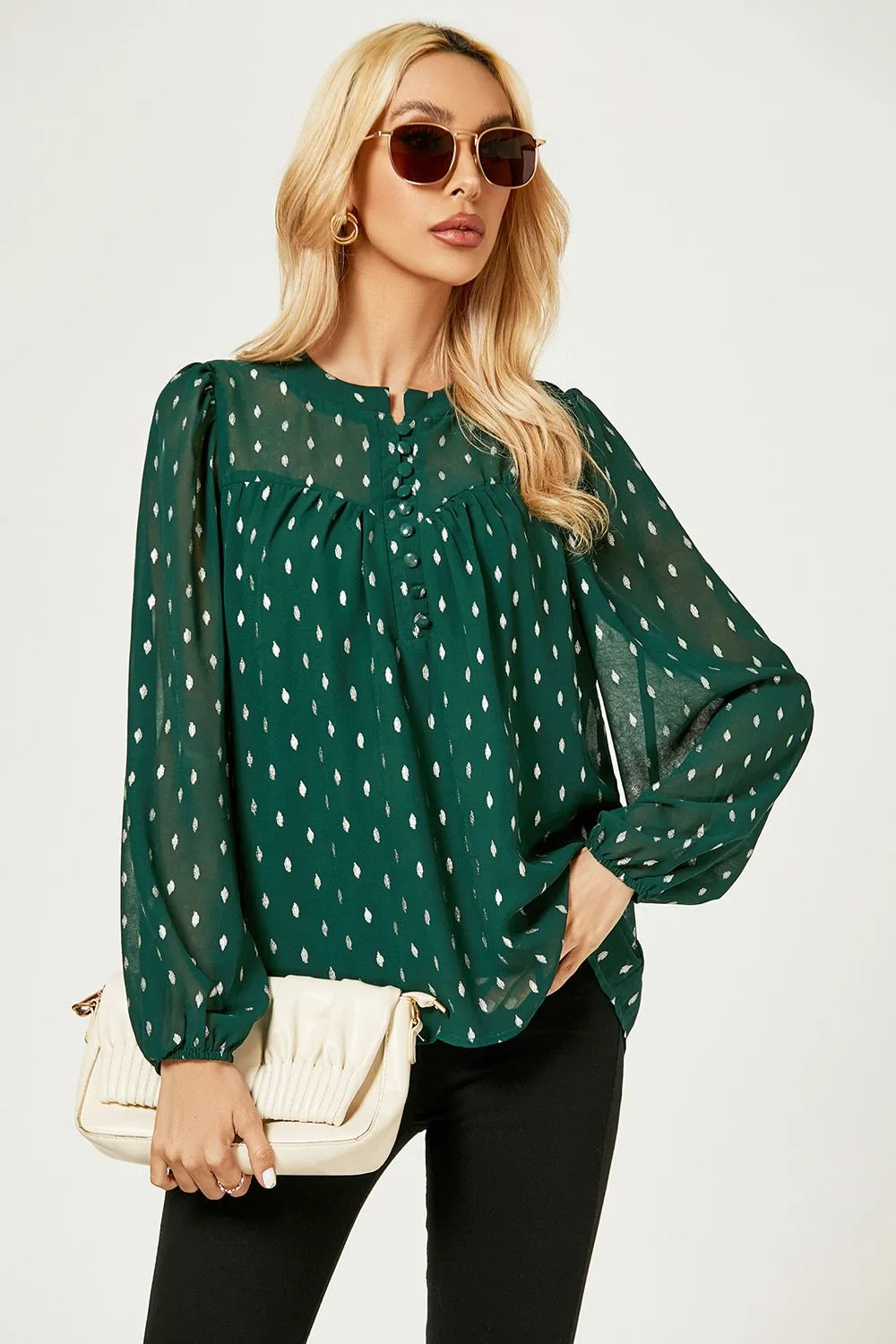 Sale!Silver Foil Button Detail Wrinkled Tulle Long Sleeve Blouse Top