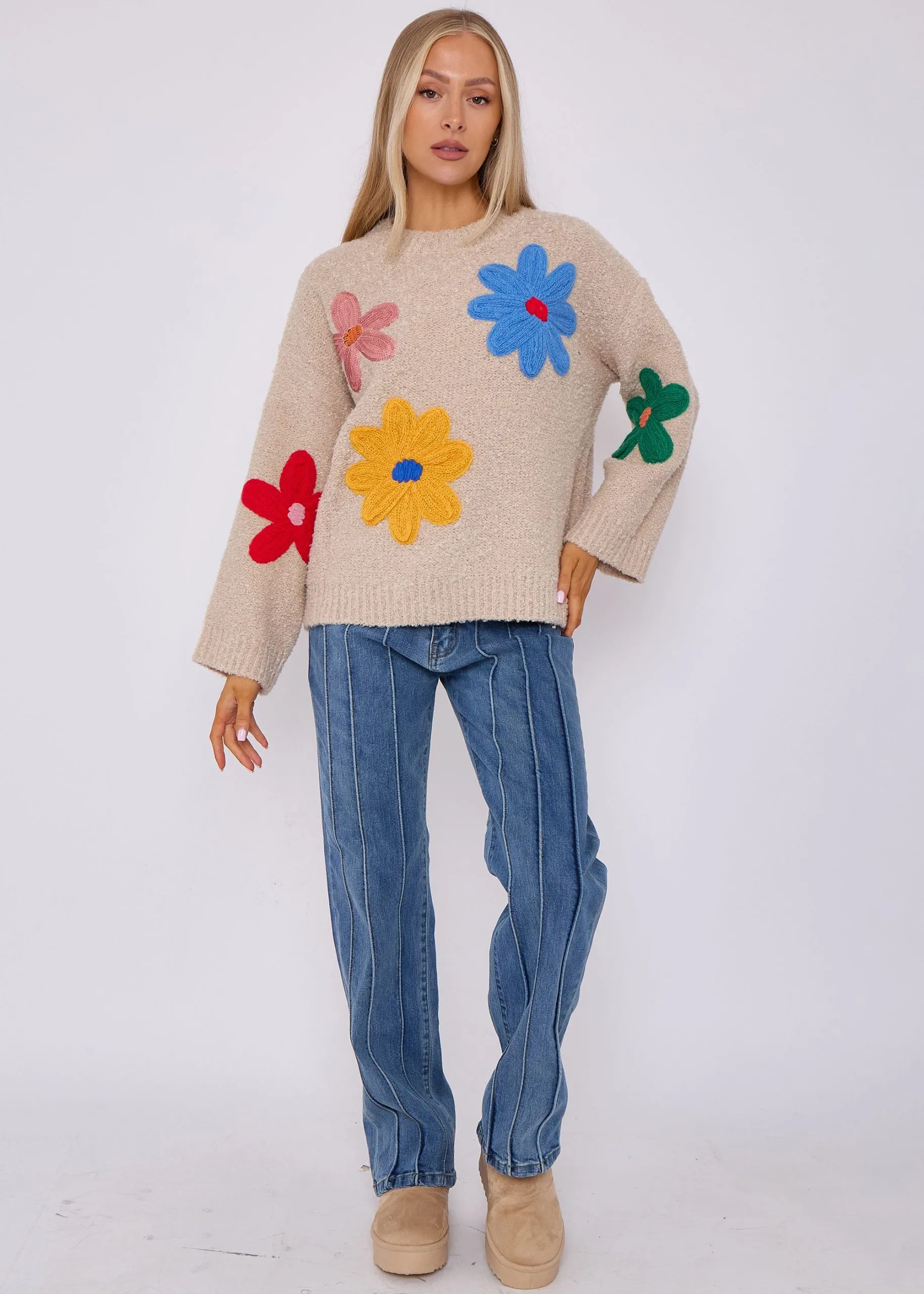 Sale!Beige Floral Applique Oversized Jumper