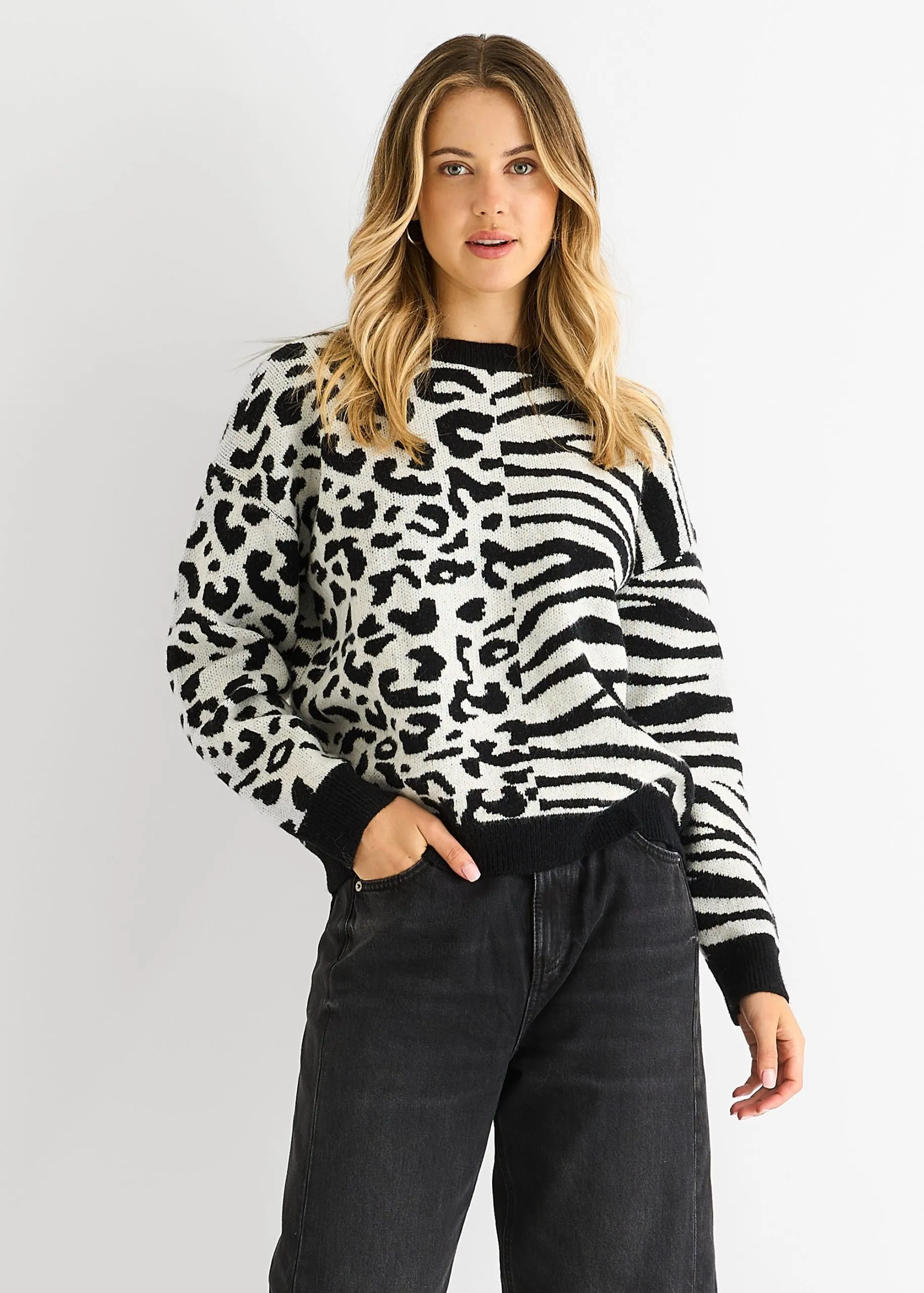 Sale!Black Contrast Zebra Animal Knit Jumper