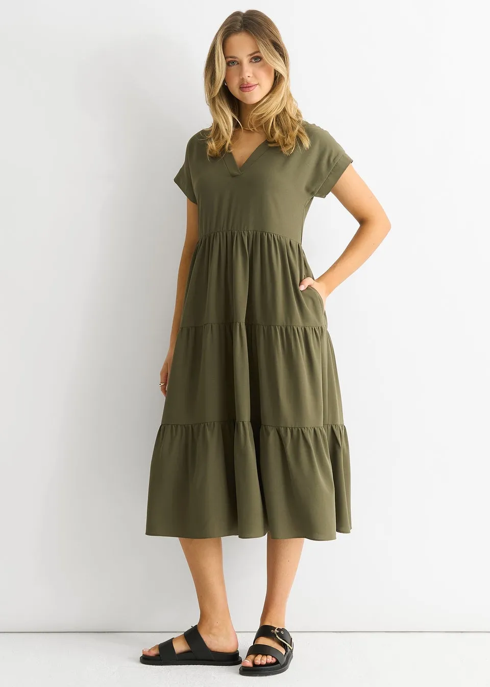 Sale!Gini London Khaki V Neck Pocket Smock Midi Dress